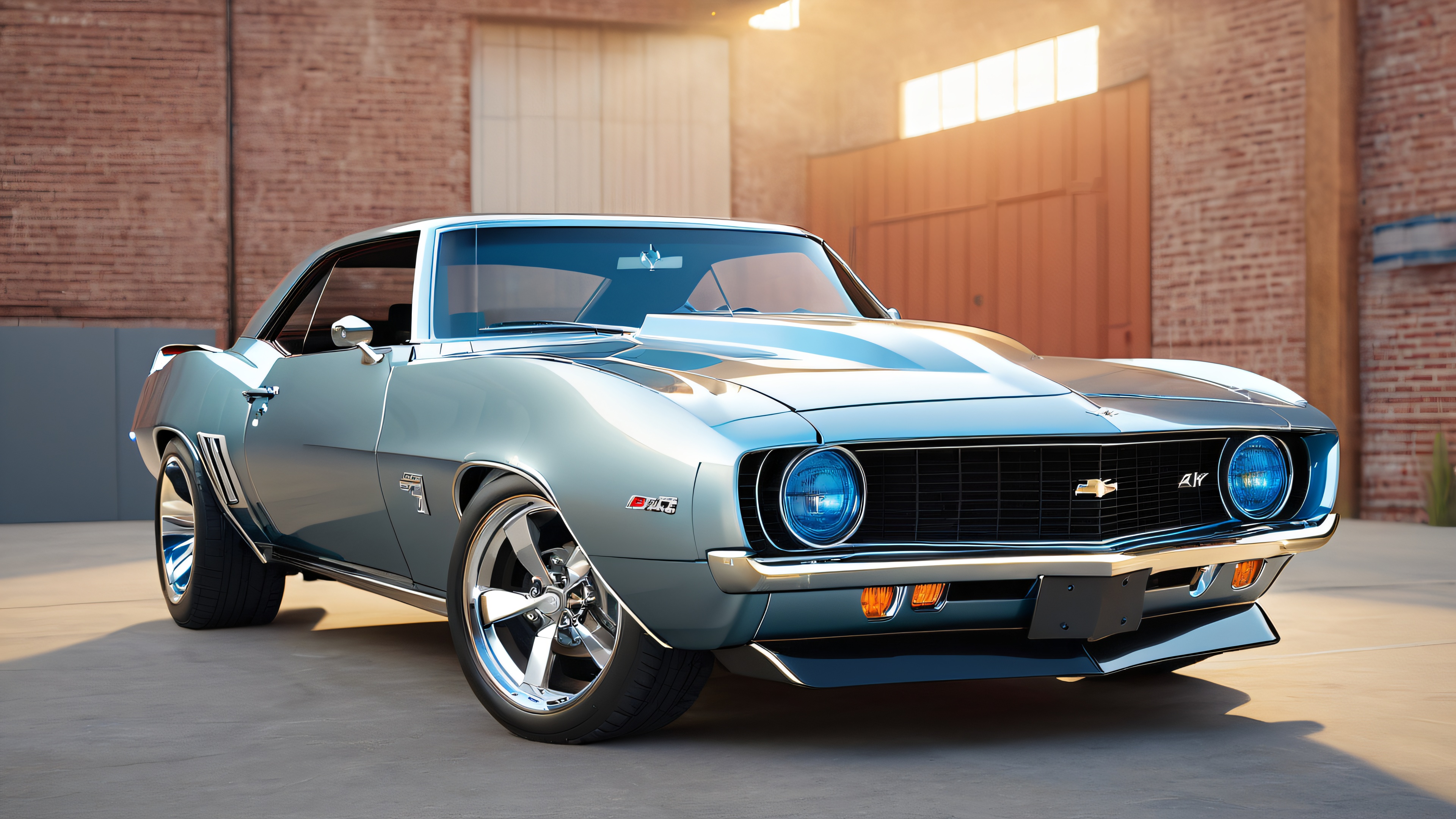 This stunning 4K wallpaper features a meticulously restored 1969 Chevrolet Camaro, showcased in a dimly lit industrial backdrop with exposed brick walls and metal beams. The Camaro’s gleaming silver and chrome accents, swooping lines, and menacing stance are captured in photorealistic detail, with subtle texture and reflective surfaces. The warm, golden lighting and cool, blue-tinged highlights create a sense of drama and tension, highlighting the Camaro’s sleek and powerful design.