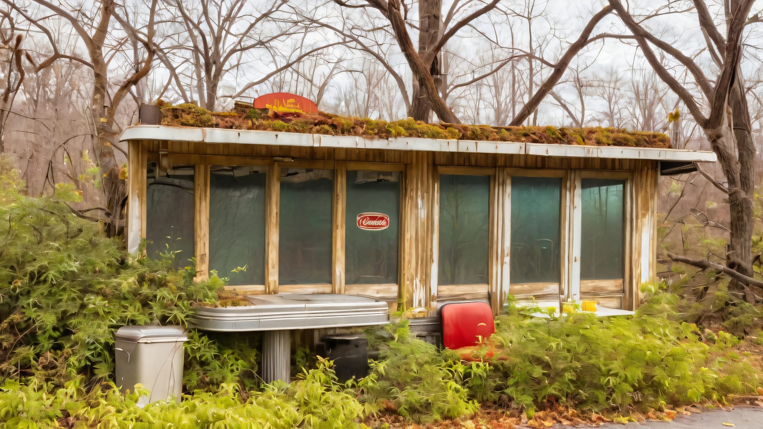 A hauntingly beautiful scene captures the essence of decay and neglect. Weathered wooden booths and tables bear remnants of forgotten meals, while overgrown parking lots and dense woods with gnarled tree branches add to the sense of abandonment. Soft, golden light casts long shadows across the facade, emphasizing the theme of nostalgia.