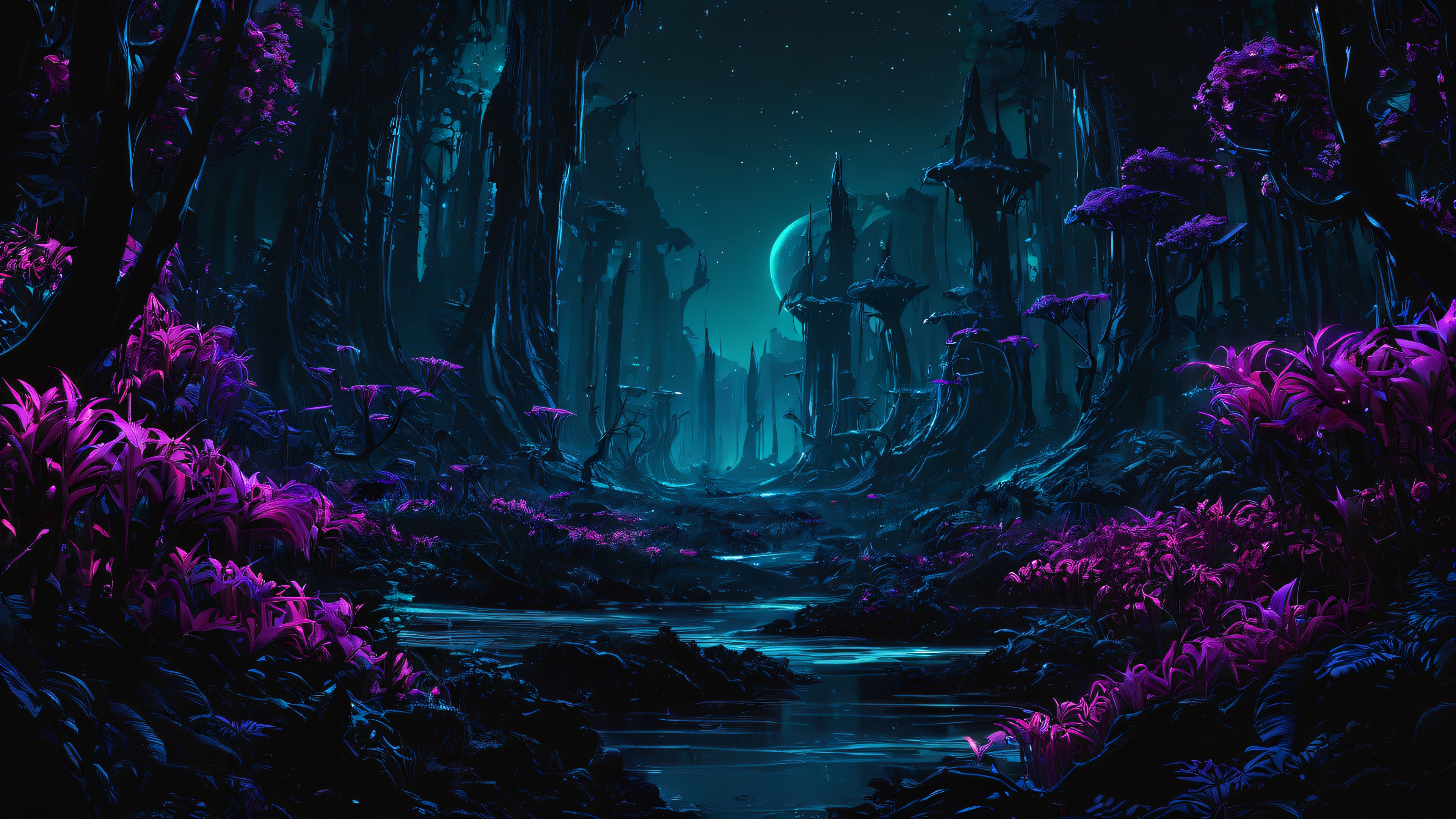 This stunning 16:9 desktop wallpaper transports you to an otherworldly realm, where vibrant neon hues and luminescent accents illuminate the intricate details of a fantastical alien forest. The crisp contrast and deep blacks create a sense of depth, while the elegant low-key lighting adds an air of mystery to this breathtaking scene.