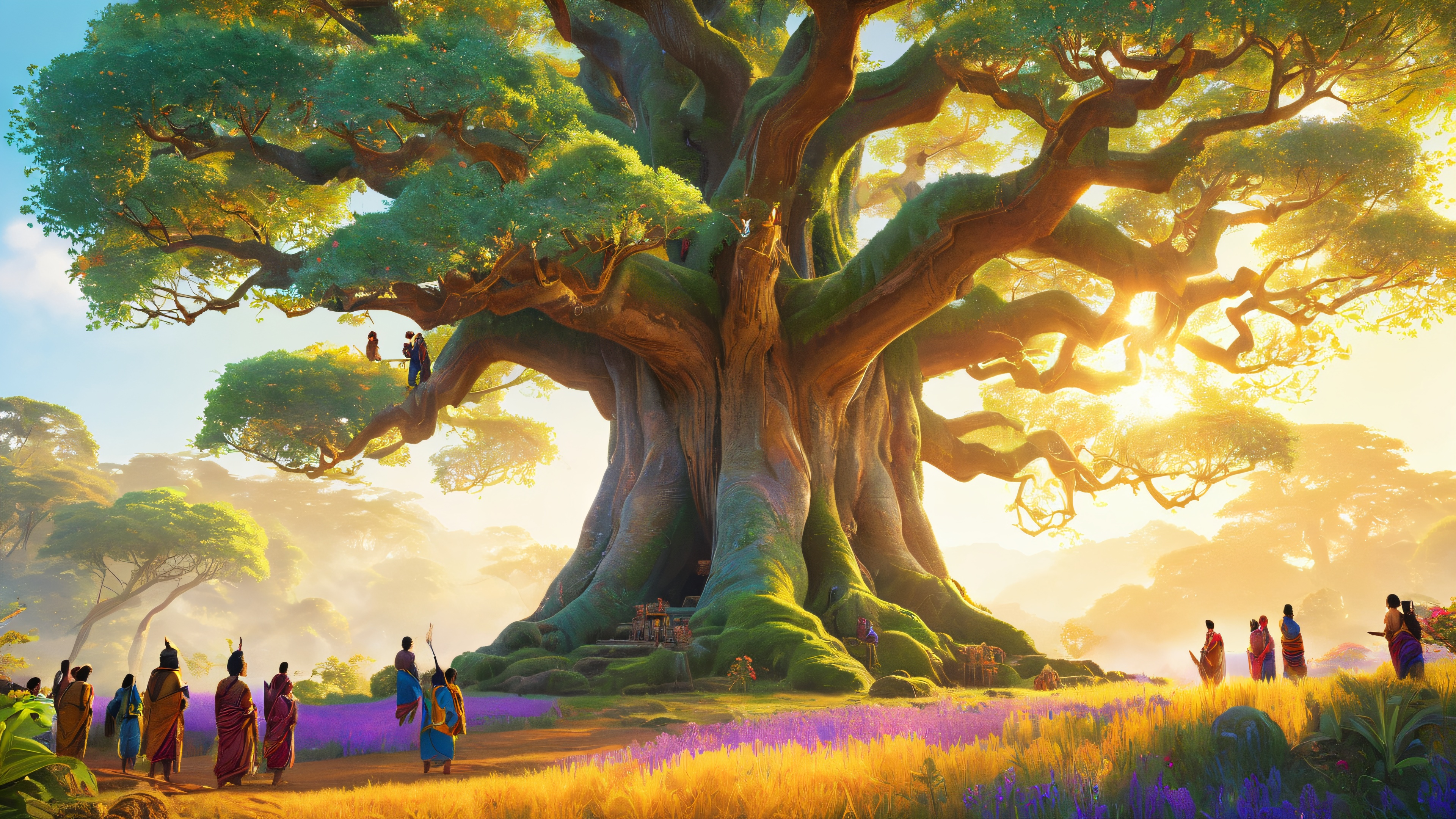 This 4K desktop wallpaper features a breathtaking scene of tribespeople gathered around an ancient tree, its trunk adorned with vibrant, ritualistic symbols that glow with an ethereal energy. The figures’ faces are painted with ceremonial designs, reflecting their connection to the natural world and mystical forces. The lush, dense jungle teems with exotic plants and towering trees, with vines and creepers snaking around the ancient tree’s massive trunk. The air is thick with the scent of blooming flowers and the distant calls of exotic birds. The soft, golden hour lighting casts long shadows across the forest floor, while the ancient tree’s energy glow subtly illuminates the gathering, imbuing the scene with an otherworldly aura.