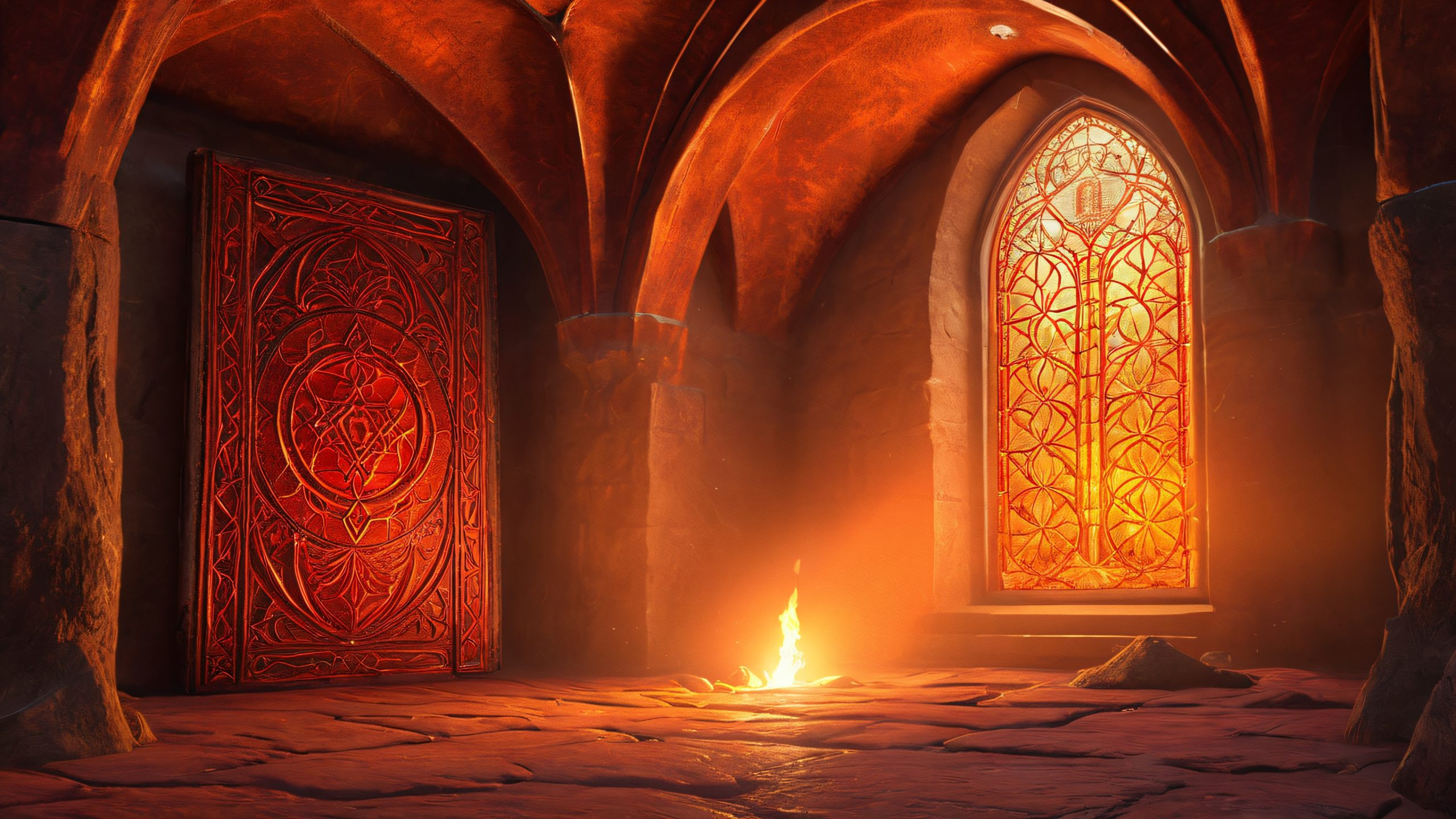 This breathtaking 4K wallpaper features an ancient, mystical tome bound in worn, crimson leather, adorned with intricate, ethereal runes that seem to pulse with a soft, malevolent glow. The tome is set in a dimly lit, ornate chamber with stone walls adorned with cobweb-covered tapestries and a high, vaulted ceiling featuring a stained glass window depicting a fiery, apocalyptic landscape. The overall aesthetic is reminiscent of dark, gothic fantasy illustration, with muted, warm candlelight and hints of eerie, flickering shadows. The color palette is deep, rich crimson, accented with muted, earthy tones of terracotta, sienna, and umber, with hints of golden, sunset hues.