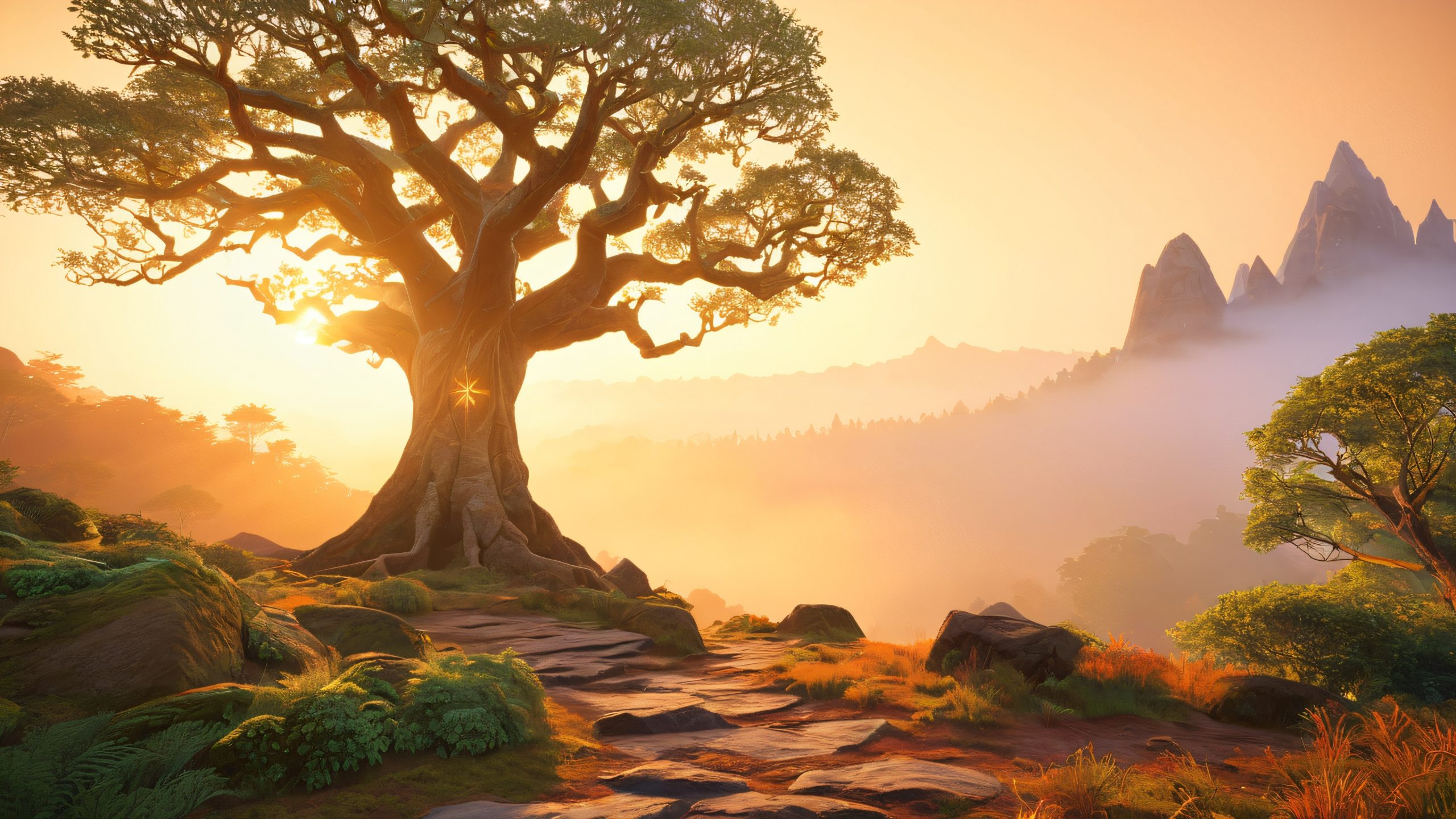 A majestic, ancient tree stands tall amidst a misty, dawn-lit forest landscape. Glowing runes etched into the trunk shine like beacons of wisdom. A worn leather-bound map lies open on a rocky outcropping, depicting the vast expanse of Hyrule’s sacred lands. Wispy fairy lights illuminate the path forward, casting a warm, golden glow across the terrain.