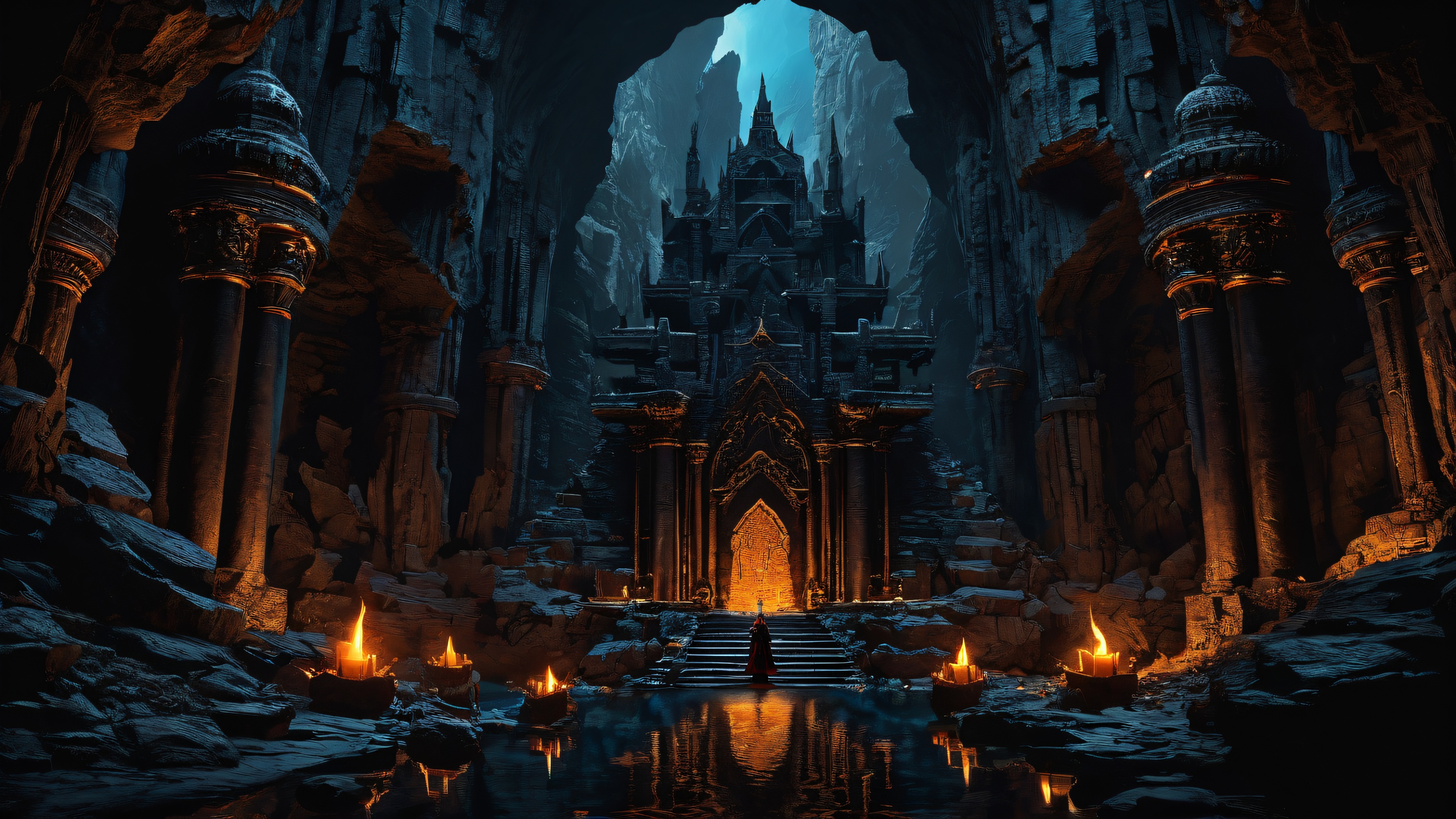 This breathtaking digital art masterpiece showcases an exquisite cavernous dungeon, bathed in deep rich colors and luminous highlights. The dominant blues evoke a sense of mysticism, while hints of gold and crimson add a touch of wisdom. The sleek dark mode aesthetic is perfectly complemented by the 16:9 aspect ratio, creating a visually stunning composition with intricate micro-details and highly textured surfaces.