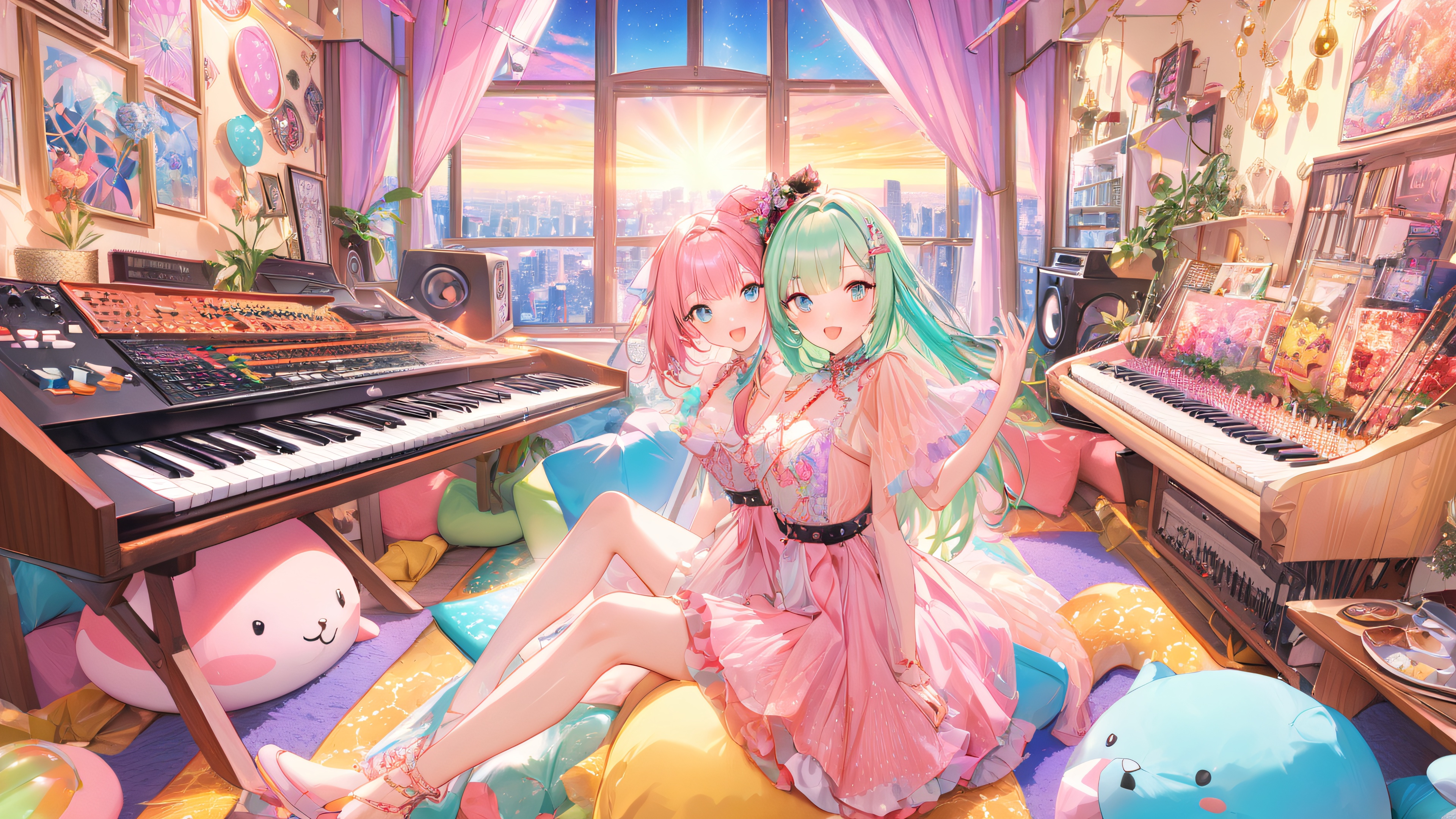 This stunning 4K wallpaper features a group of passionate women gathered around a vintage keyboard and microphone setup, surrounded by colorful instruments, sheet music, and Japanese snacks. The scene is set in a cozy retro-style living room with a plush carpet, wooden furniture, and a large window with a subtle cityscape view. The illustration is hand-drawn with bold lines, vibrant colors, and intricate details, featuring a soft and warm atmosphere with a mix of natural and artificial light sources. The dominant palette of soft pinks and whites creates a sense of Japanese pop culture and fashion, making this a perfect wallpaper for anime lovers.