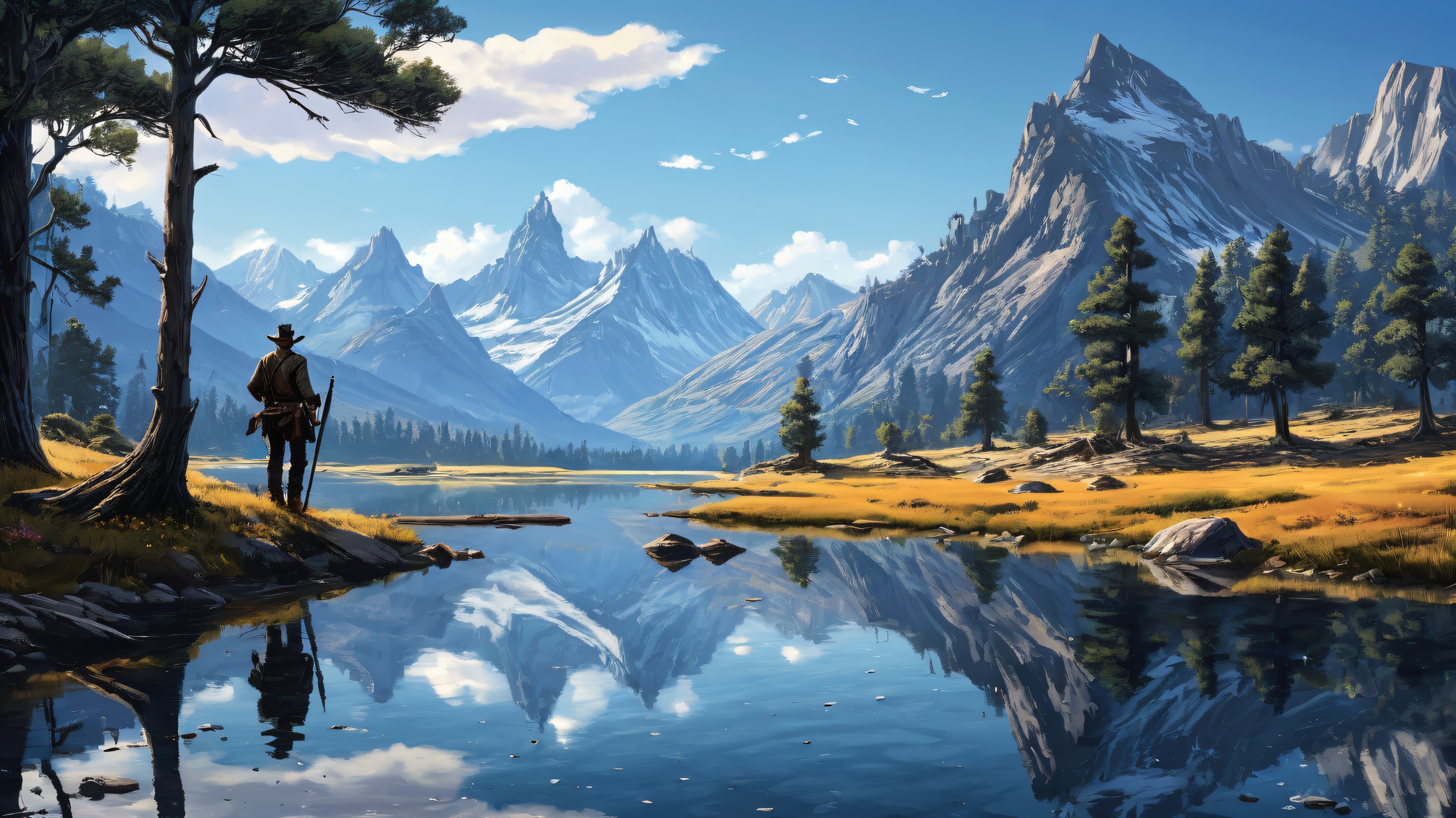 A breathtaking desktop wallpaper of Arthur Morgan, perfectly clean vast pure void, extreme depth of field, award-winning digital art, pristine clarity, ETHEREAL LIGHTING. Radiant, brilliant colors, ray traced reflections, and pristine clarity. Bright and airy., [‘dark blues’, ‘moonlit whites’], 16:9 aspect ratio, ethereal lighting, radiant, brilliant colors, ray traced reflections, pristine clarity, award-winning digital art, epic breathtaking scale, stunning visual impact, perfect composition, highly textured surfaces, intricate micro-details, physically based rendering, macOS wallpaper aesthetic, masterpiece, highest quality, highly detailed, 8k resolution.