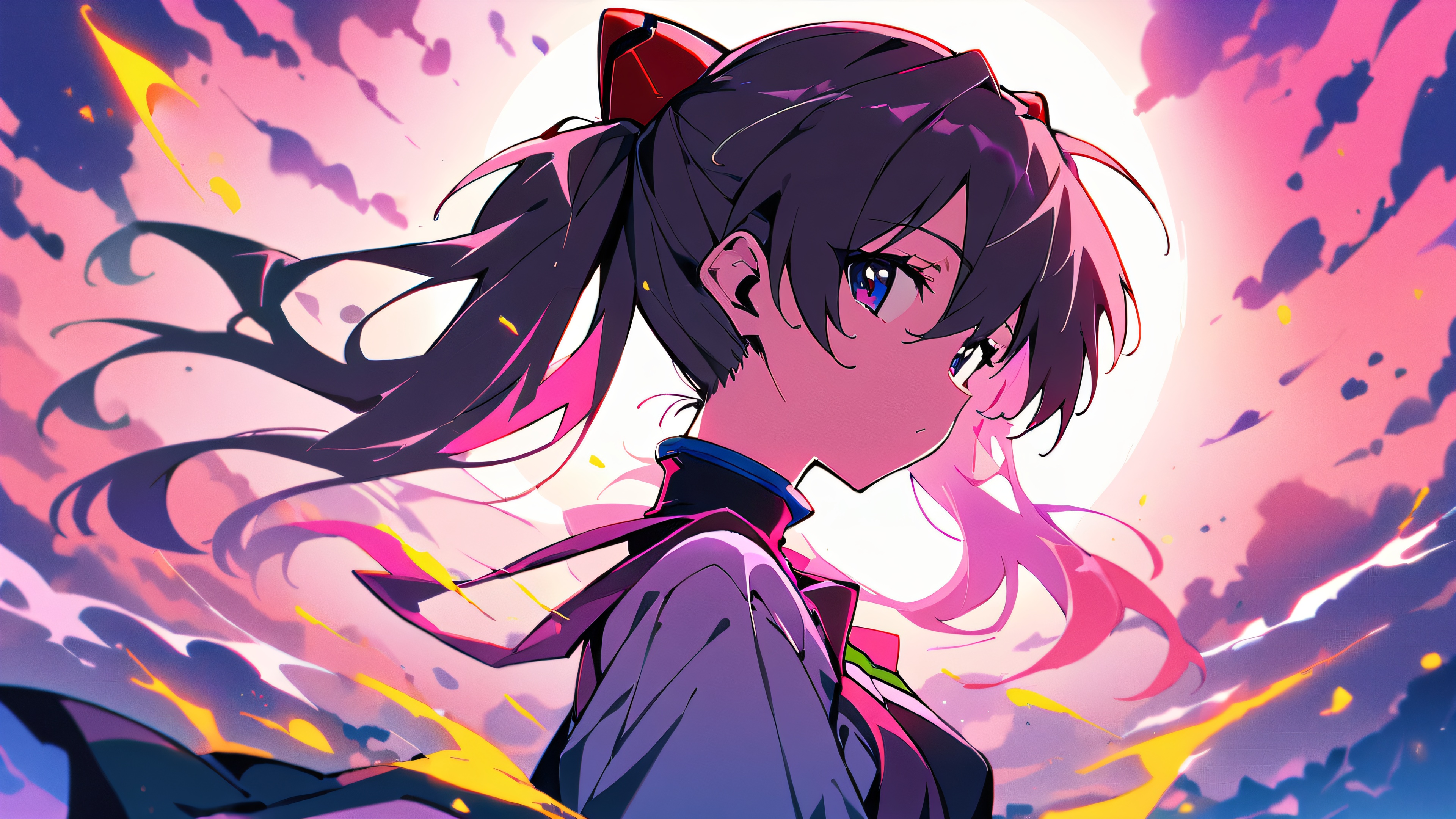 1girl, asuka langley soryu, neon genesis evangelion, solo, masterpiece, best quality, very aesthetic, absurdres, highly detailed, looking at viewer, perfectly clean vast pure void, extreme depth of field, [‘pink’, ‘purple’], 16:9 aspect ratio, bright and airy, ethereal lighting, beautiful sky, cinematic lighting, vivid colors