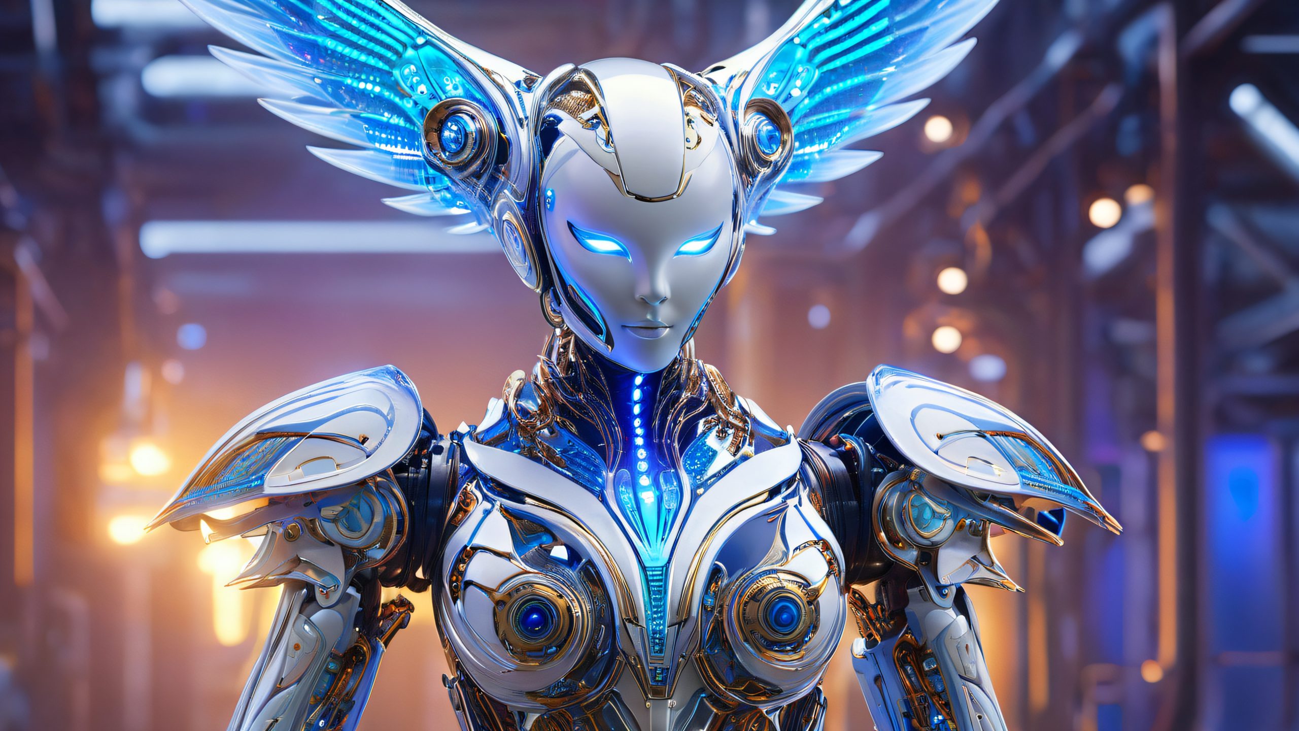 This breathtaking 4K wallpaper features a luminescent, winged humanoid figure with metallic, biomechanical limbs and torso, encrusted with glowing, iridescent circuitry. The character’s face is a mesh of tiny, pulsing LEDs, forming a mesmerizing, fractal-like pattern. The figure’s eyes glow with an ethereal blue light, as if powered by an inner energy core. Delicate, swirling patterns of fiber-optic tendrils adorn the biomechanical appendages, giving the impression of a living, breathing entity. The industrial background features exposed pipes, rusty machinery, and flickering fluorescent lights, with the air thick with the haze of industrial smoke and the sound of machinery humming in the distance.