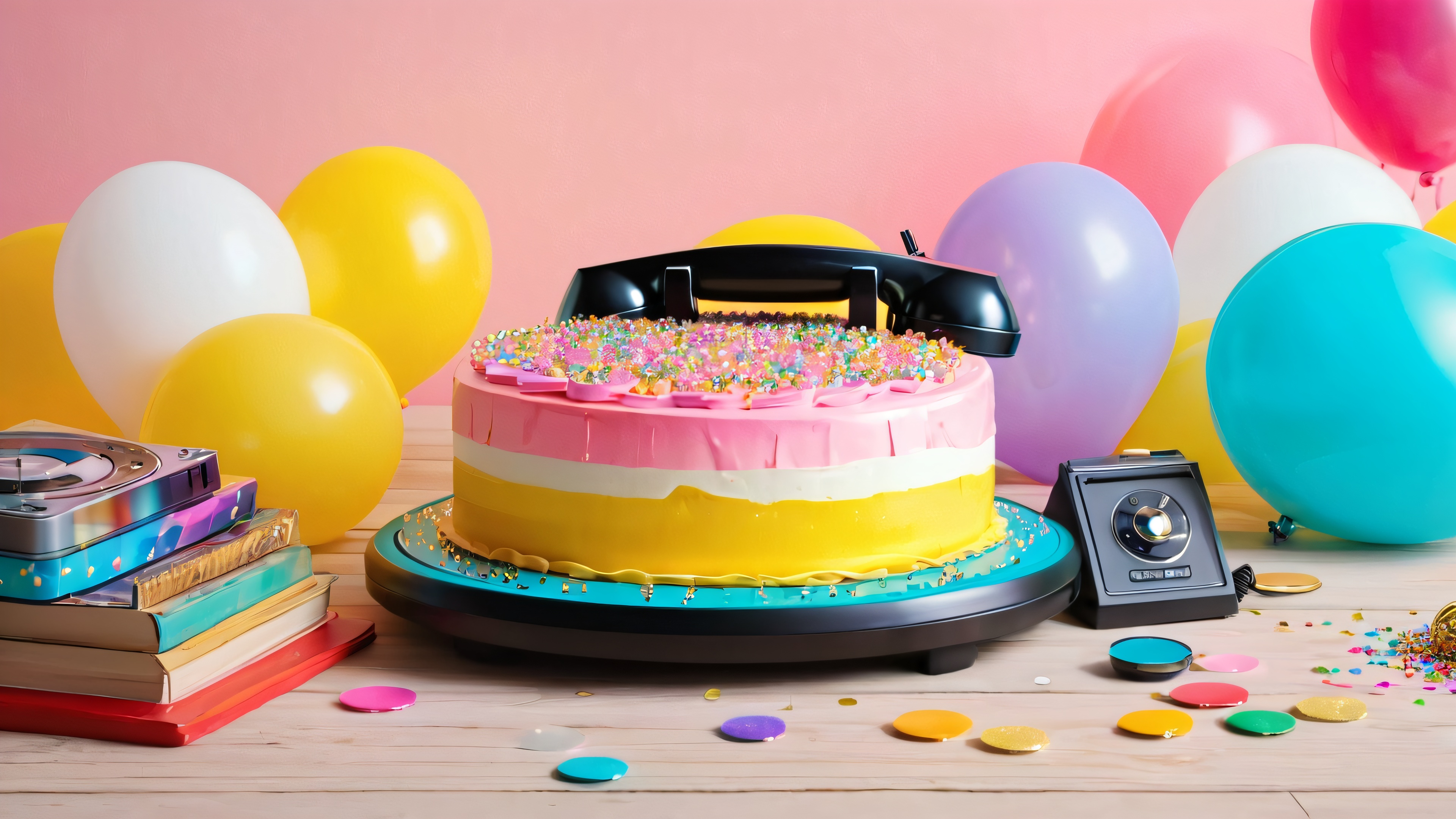 This vibrant wallpaper features a colorful celebration scene with a large birthday cake, surrounded by confetti-filled balloons and a sprinkle of edible glitter. The setting is a cluttered living room with worn furniture and nostalgic decorations from past decades, including VHS tapes, cassette players, and vinyl records. The artwork style is reminiscent of hand-drawn comic art with bold lines and vibrant colors. Soft golden hour lighting adds warmth and depth to the scene, casting gentle shadows on the characters and objects.