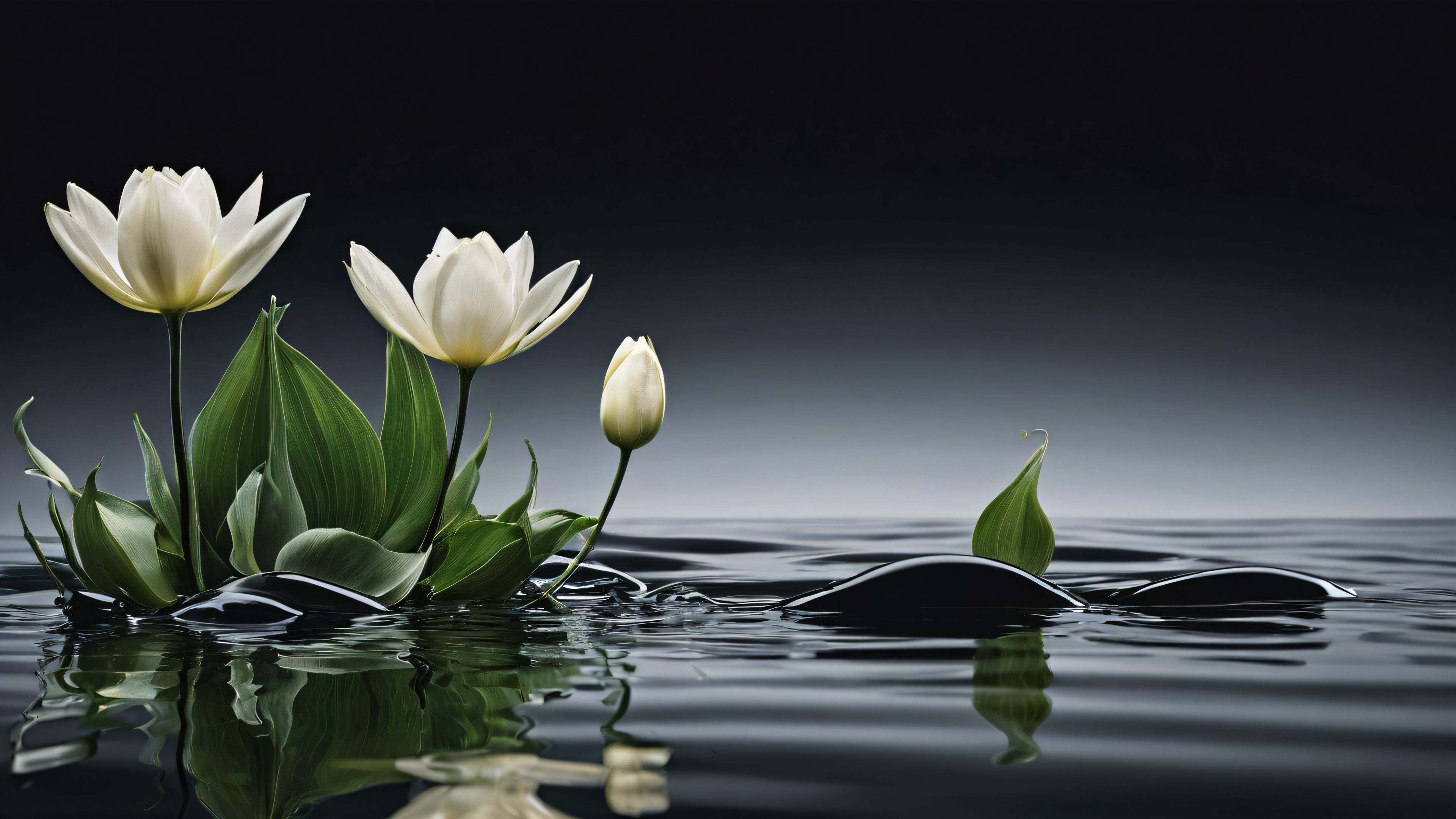 A breathtaking desktop wallpaper of Flowers and Water, Perfectly clean vast pure void, extreme depth of field with subtle water ripples and a hint of fog, Award-winning digital art, pristine clarity with delicate brushstrokes, SLEEK DARK MODE AESTHETIC with deep perfect blacks, striking crisp contrast, and elegant luminescent accents, {‘dominant’: ‘#8BC34A’, ‘mood’: ‘Soft Greenish-Beige’}, 16:9 aspect ratio, elegant low-key lighting, deep perfect blacks, striking contrast, sleek dark mode aesthetic, luminescent accents, deep rich colors, award-winning digital art, epic breathtaking scale, stunning visual impact, perfect composition, highly textured surfaces, intricate micro-details, physically based rendering, macOS wallpaper aesthetic, masterpiece, highest quality, highly detailed, 8k resolution.