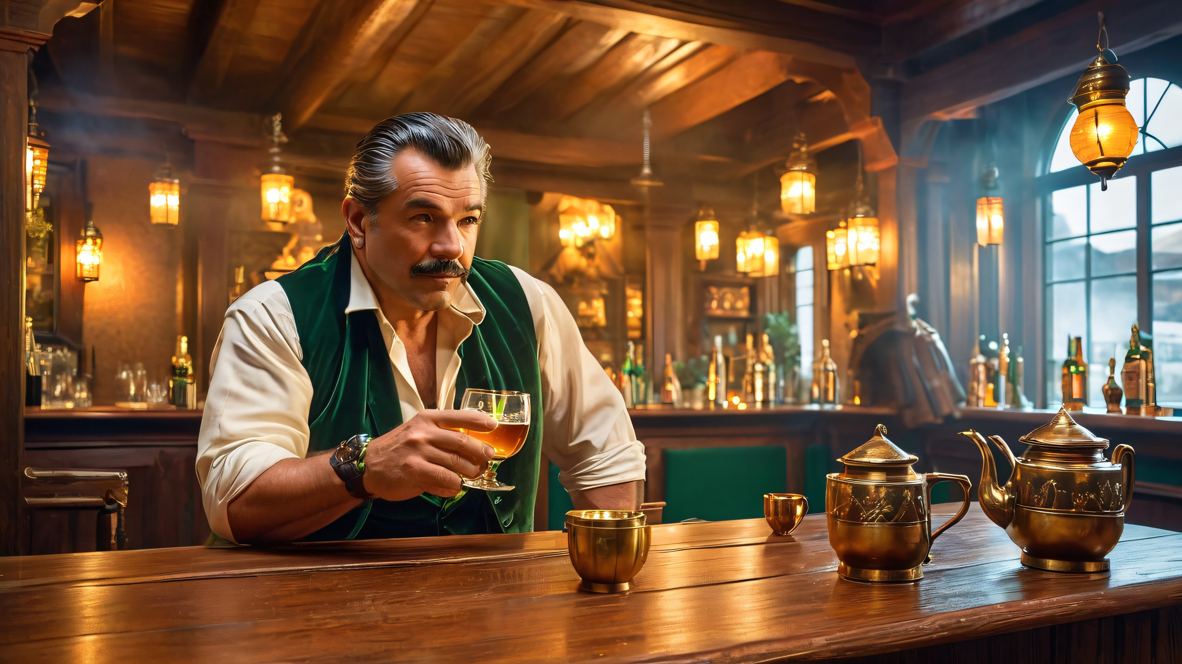 Immerse yourself in this breathtaking 4K desktop wallpaper featuring Bruno Malocchio, the imposing proprietor of the infamous Dragon’s Den betting house. Notice the intricate details of the worn wooden floorboards, wooden beams, and dusty tapestries adorning the vaulted ceiling. The warm, golden glow of candles and lanterns casts a mystical aura over the scene, while Bruno’s piercing green eyes gleam like emeralds in the dim light. The atmosphere is filled with the haze of smoky whiskey and the promise of good fortune and prosperity.