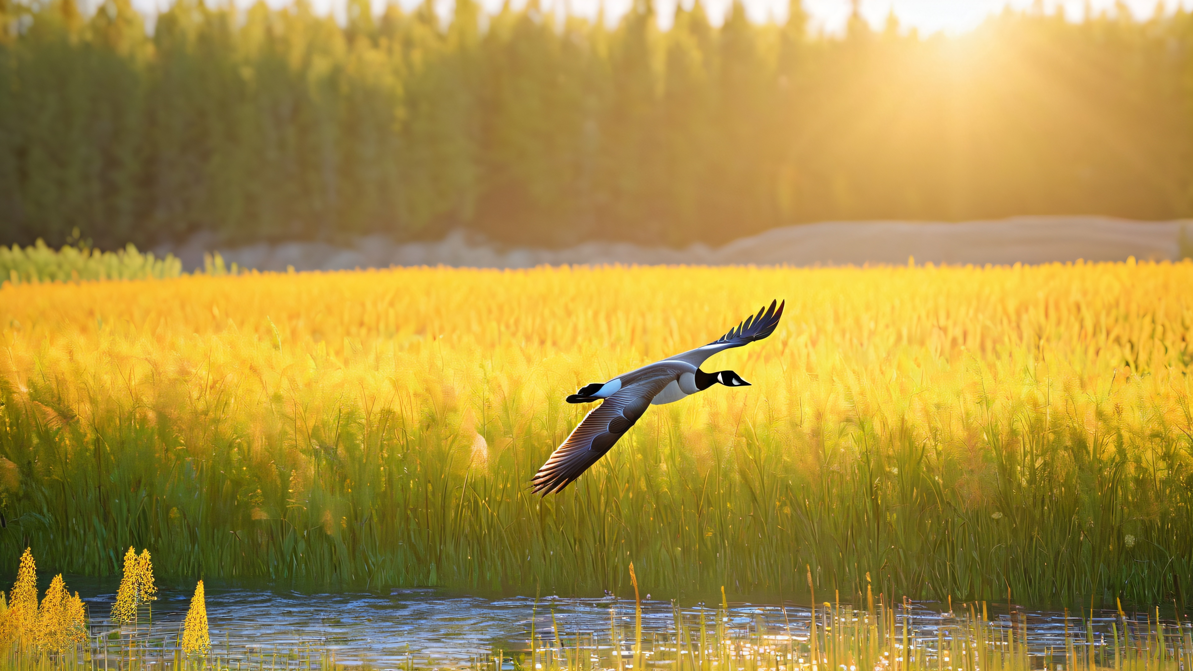 This stunning 4K wallpaper features a majestic Canada goose in flight, its white patch glistening in the golden hour light. The goose’s long neck and broad wings are perfectly rendered, as it soars effortlessly above a sleek black sedan. The car’s windshield reflects the vibrant hues of the surrounding landscape, a serene and idyllic meadow teeming with tall grasses and wildflowers. The scene is set against a subtle misty background, casting a mystical aura. The realistic 3D render features subtle texture and shading, emphasizing the textures and forms of the scene.