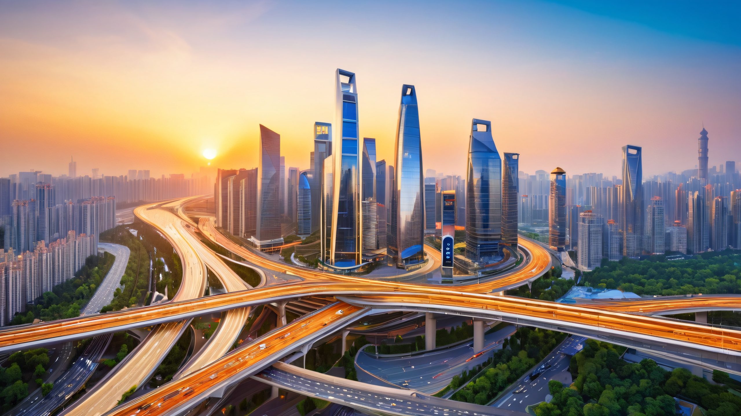 This 4K wallpaper features a majestic metropolis at the heart of Chengdu, China, with high-tech skyscrapers reflecting the warm golden light of the setting sun. The city’s infrastructure hums with energy, weaving together in a complex dance of roads, bridges, and flyovers. The urban landscape is replete with towering buildings, bustling streets, and a gentle haze of urban life.