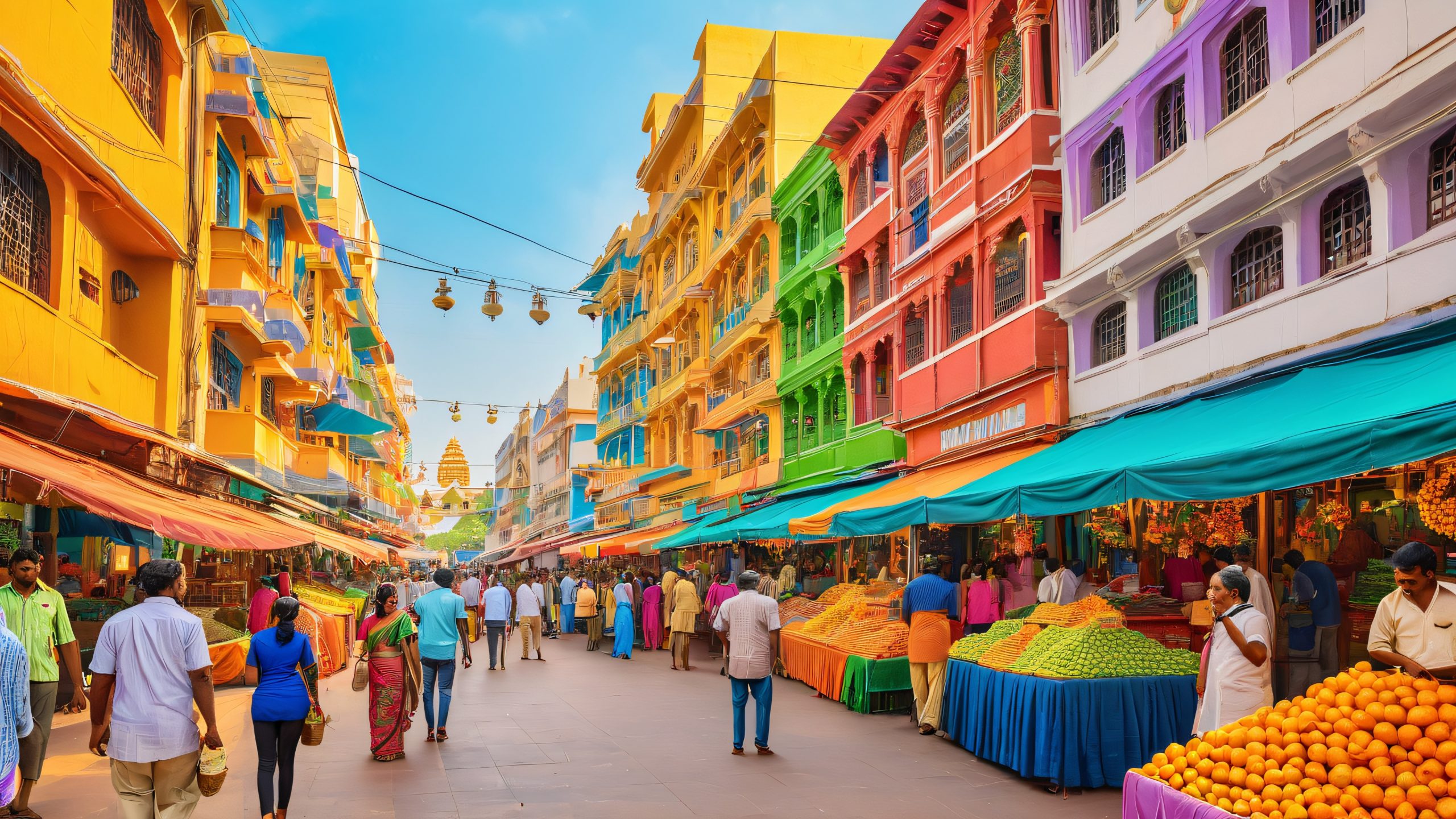 This stunning 4K wallpaper showcases the vibrant street art installations in Chennai’s bustling market. The scene is filled with colorful murals, intricate Indian motifs, and patterns, set against a backdrop of vendors selling fresh produce, spices, and textiles. The atmosphere is lively and energetic, with a blend of ancient buildings, modern infrastructure, and street lamps creating a cozy and inviting ambiance. The warm golden natural light and subtle artificial lighting add depth and texture to the scene, while the rich colors reflect the city’s cultural heritage and urban vibrancy.