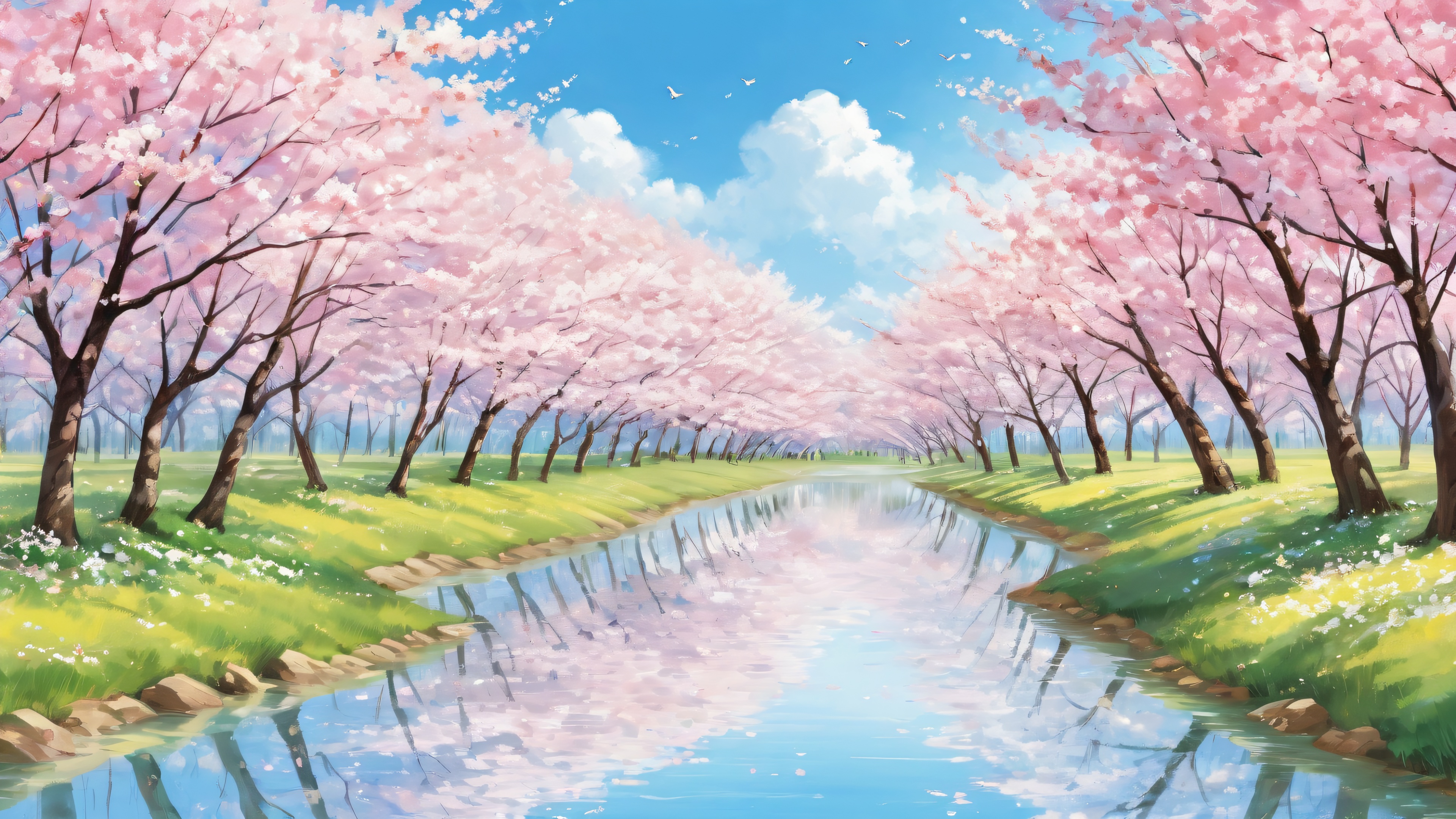 A breathtaking desktop wallpaper of Cherry Blossom Grove, Perfectly clean vast pure void, extreme depth of field, floating cherry blossom trees against a bright blue sky, Award-winning digital art, pristine clarity, watercolor-inspired illustrations, Ethereal lighting with radiant brilliant colors, ray-traced reflections, and pristine clarity. Bright and airy with soft, warm sunlight, {‘type’: ‘Palette’, ‘colors’: [‘Soft Pink’, ‘Light Yellow’, ‘Cream White’, ‘Sky Blue’]}, 16:9 aspect ratio, ethereal lighting, radiant, brilliant colors, ray traced reflections, pristine clarity, award-winning digital art, epic breathtaking scale, stunning visual impact, perfect composition, highly textured surfaces, intricate micro-details, physically based rendering, macOS wallpaper aesthetic, masterpiece, highest quality, highly detailed, 8k resolution.