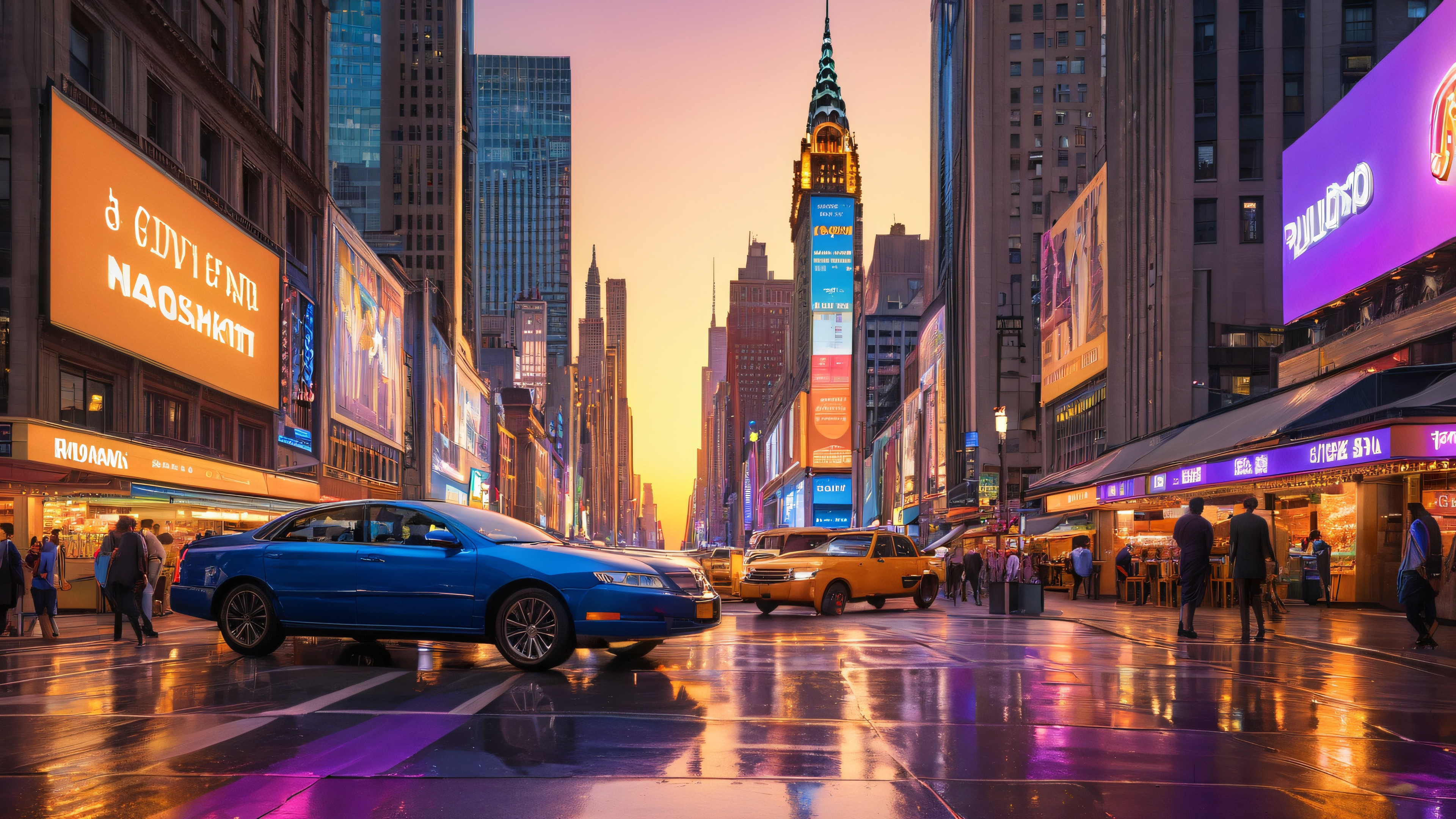 This breathtaking 4K wallpaper captures the essence of a city’s urban landscape at sunset. The scene is set against a dramatic backdrop of twinkling lights, neon billboards, and a majestic city skyline. The bustling city square is lined with iconic landmarks, modern architecture, and a diverse array of street performers, food vendors, and pedestrians. The soft, warm sunlight casts a golden glow over the city, with long shadows stretching across the pavement as the sun dips below the horizon, illuminating the city’s vibrant nightlife.