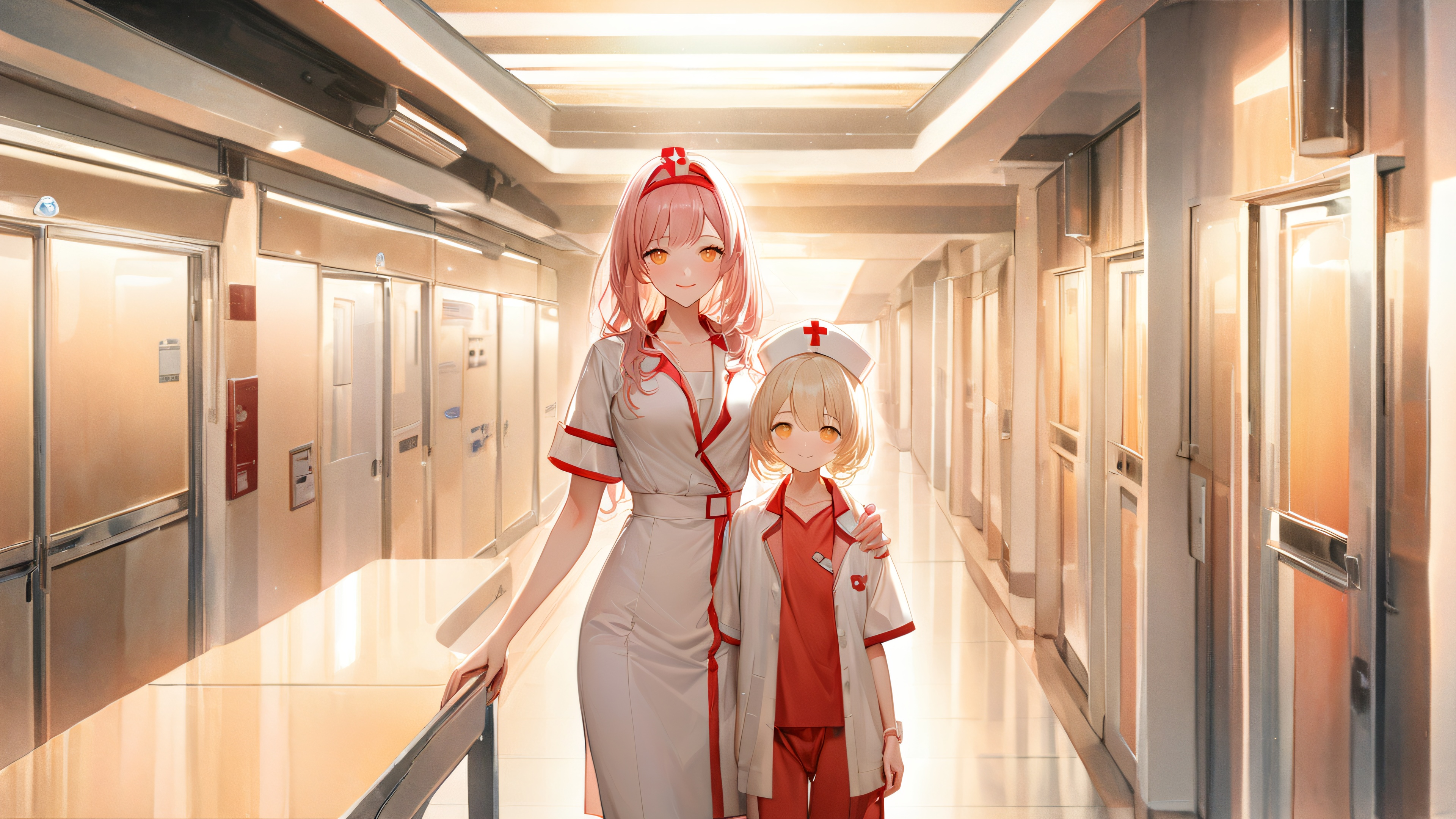 This stunning 4K wallpaper features a nurse with a kind face and a hint of a smile, standing in a well-lit hospital corridor. Her crisp white uniform and bright red scrubs contrast against the sterile white walls, while the soft glow of overhead lights adds warmth to the scene. The nurse gently holds a young patient’s hand, exuding warmth and compassion. The background features a bustling hospital corridor, with closed doors and the occasional passing nurse or doctor, all set against a soft hum of machinery. The watercolor-inspired digital painting is characterized by subtle texture and gentle, blended edges, with a hint of golden hour glow. The color palette features pastel hues with warm undertones, including soft pinks, gentle yellows, and creamy whites, with accents of bright red and crisp white.
