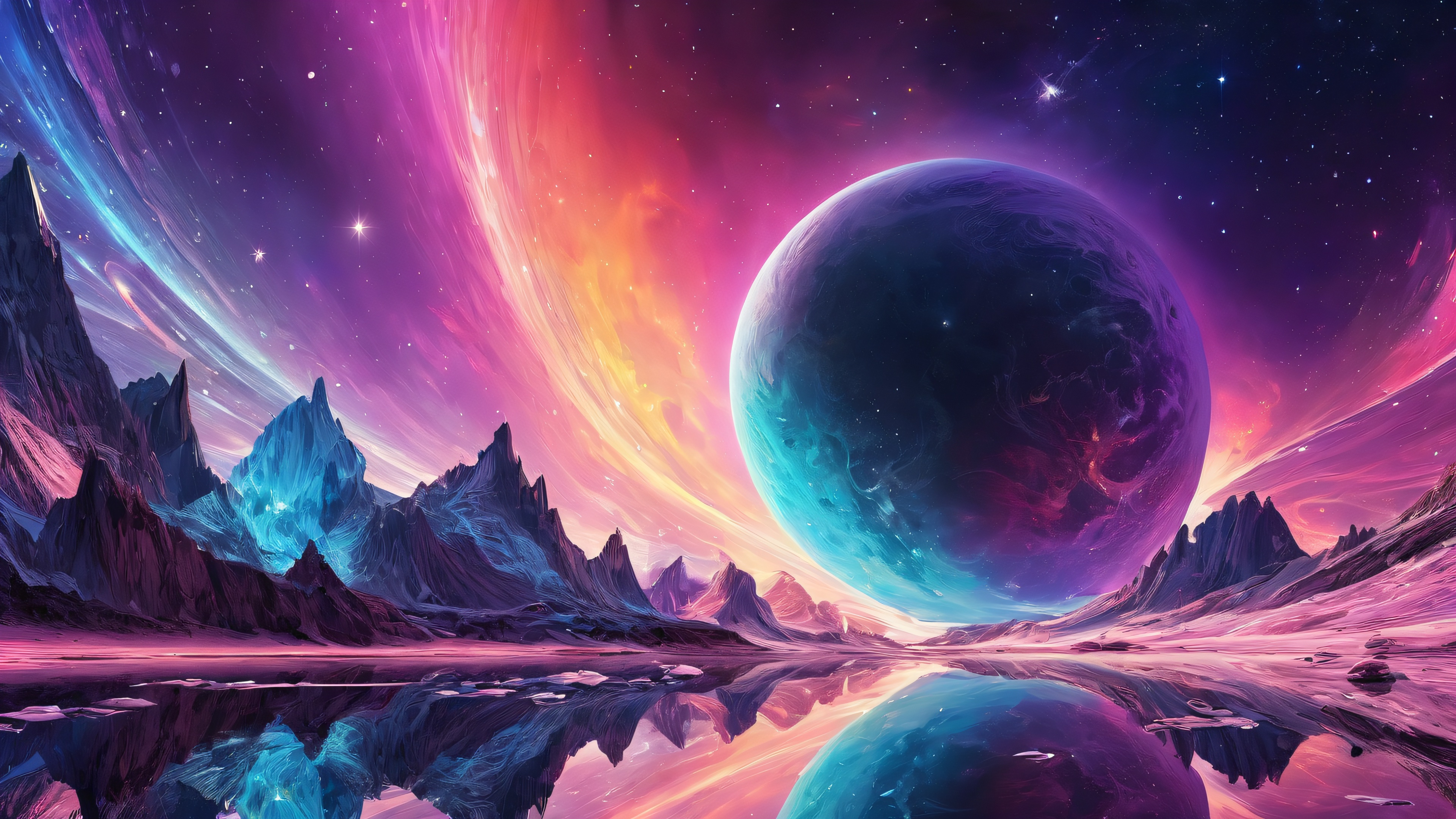 This stunning digital art piece transports you to a realm of pure serenity, where the vast expanse of space is illuminated by radiant, brilliant colors. The ethereal lighting casts an otherworldly glow, emphasizing the textured surfaces and intricate micro-details that come alive with physically based rendering. This masterpiece exudes a sense of awe-inspiring scale and visual impact, making it perfect for your Desktop/PC.