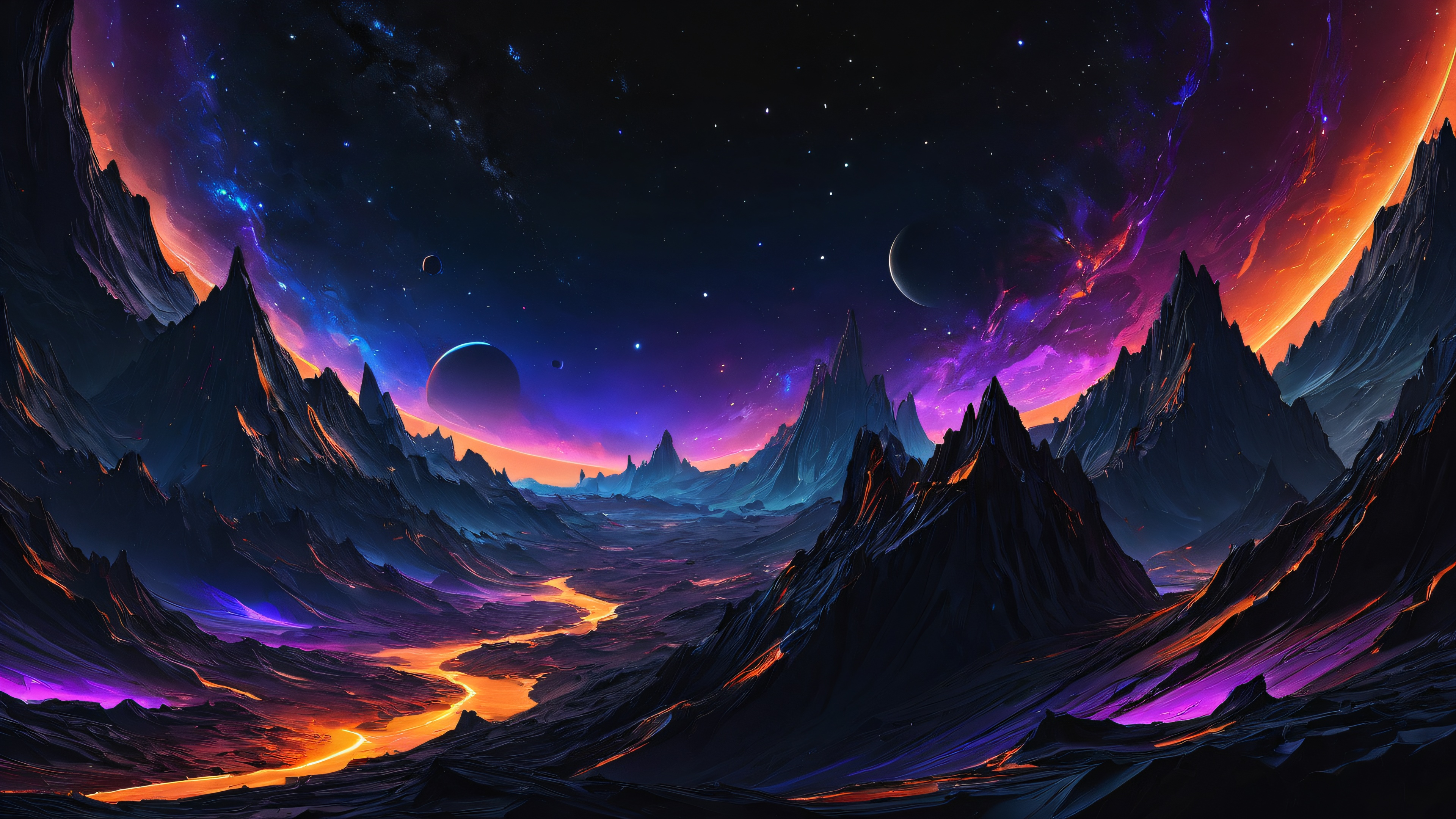 This breathtaking wallpaper transports you to the depths of space, where swirling clouds of Deep Blues, Vibrant Purples, and Electric Oranges dance across the canvas. The sleek, futuristic aesthetic is defined by deep perfect blacks, striking contrast, and elegant luminescent accents, creating a visually stunning experience that’s both awe-inspiring and mesmerizing.