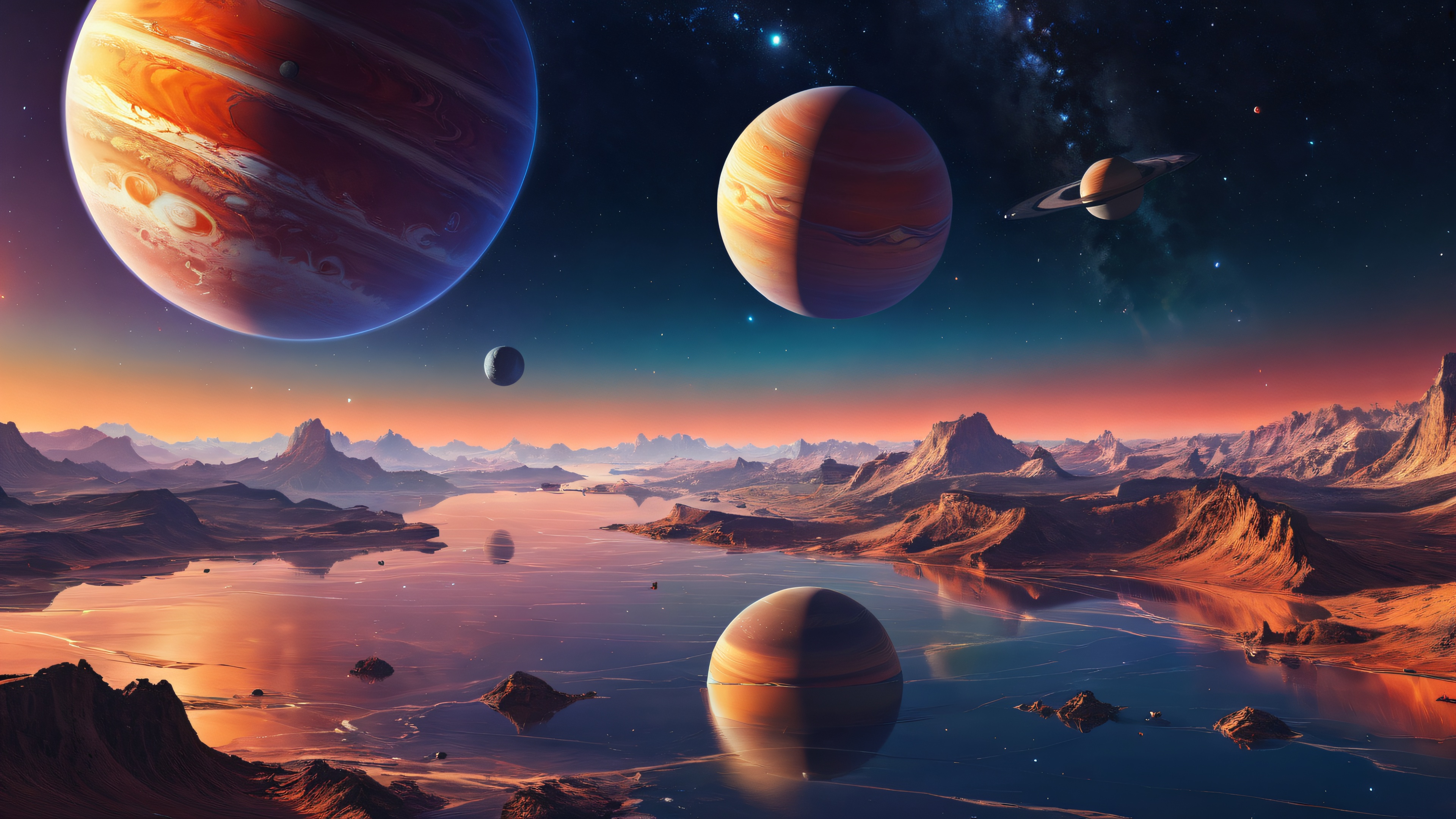 A breathtaking desktop wallpaper of Planets, perfectly clean vast pure void with extreme depth of field and a hint of starlight in the distance, award-winning digital art, pristine clarity with intricate textures and subtle gradient effects, Ethereal Lighting: Radiant, brilliant colors with ray traced reflections and pristine clarity. Bright and airy., [‘#4567b7’, ‘#8f94ff’, ‘#33ccff’], 16:9 aspect ratio, ethereal lighting, radiant, brilliant colors, ray traced reflections, pristine clarity, award-winning digital art, epic breathtaking scale, stunning visual impact, perfect composition, highly textured surfaces, intricate micro-details, physically based rendering, macOS wallpaper aesthetic, masterpiece, highest quality, highly detailed, 8k resolution.