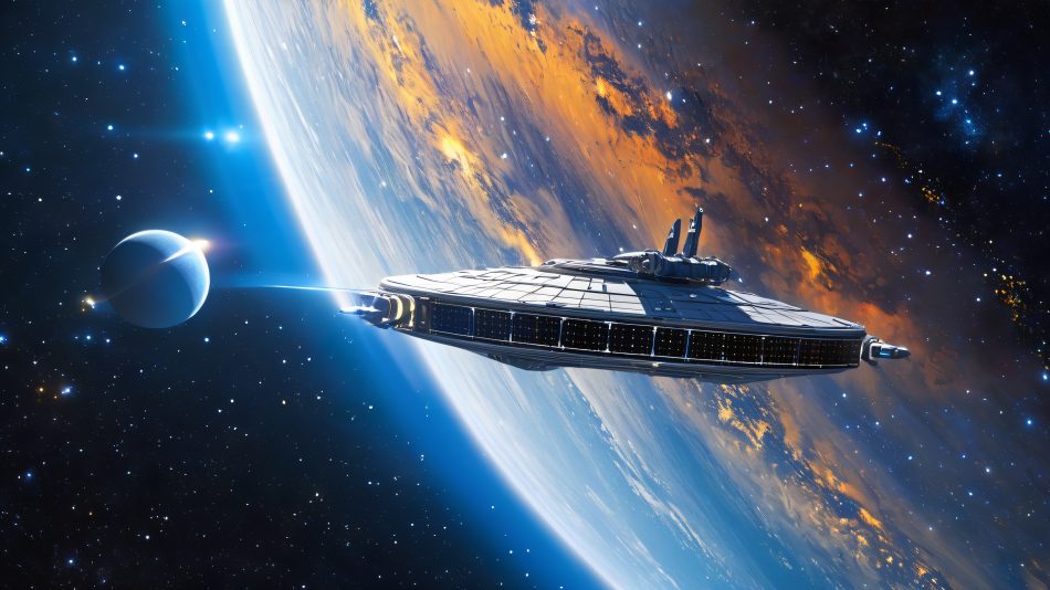 A stunning, 4K illustration of a futuristic spaceship, its sleek hull adorned with interconnected solar panels and antennae, majestically piercing the dark expanse of space. The distant planet’s blue-white glow creates a celestial halo, with stars, nebulas, and galaxies scattered across the background. Warm, golden lighting from the planet’s rings and cool, blue-white glow from the stars and galaxies blend seamlessly, adding depth and dimensionality to the scene. A palette of deep blues, silvers, and whites, with vibrant oranges and yellows, creates a masterpiece of visual storytelling.