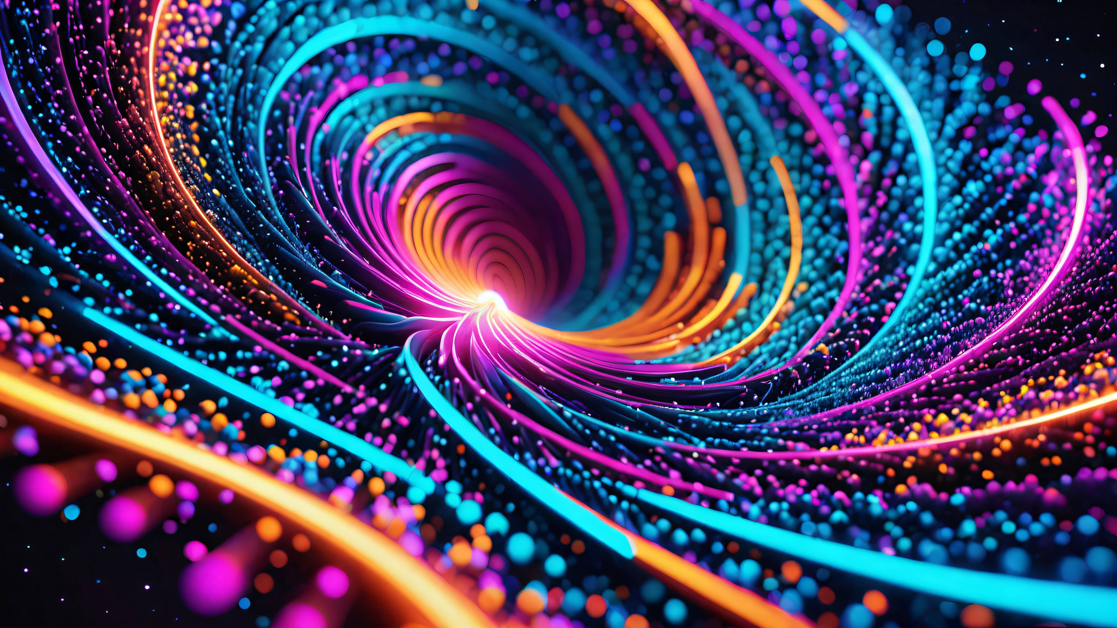 This stunning 4K desktop wallpaper features a mesmerizing, swirling vortex of 3D particles in a kaleidoscope of colors, reminiscent of a futuristic aurora borealis. The particles are abstract shapes, morphing and merging into a dynamic, ever-changing tapestry. The vast, dark expanse provides a striking contrast to the vibrant, electric hues of indigo, magenta, and cyan, with flashes of bright orange and yellow.