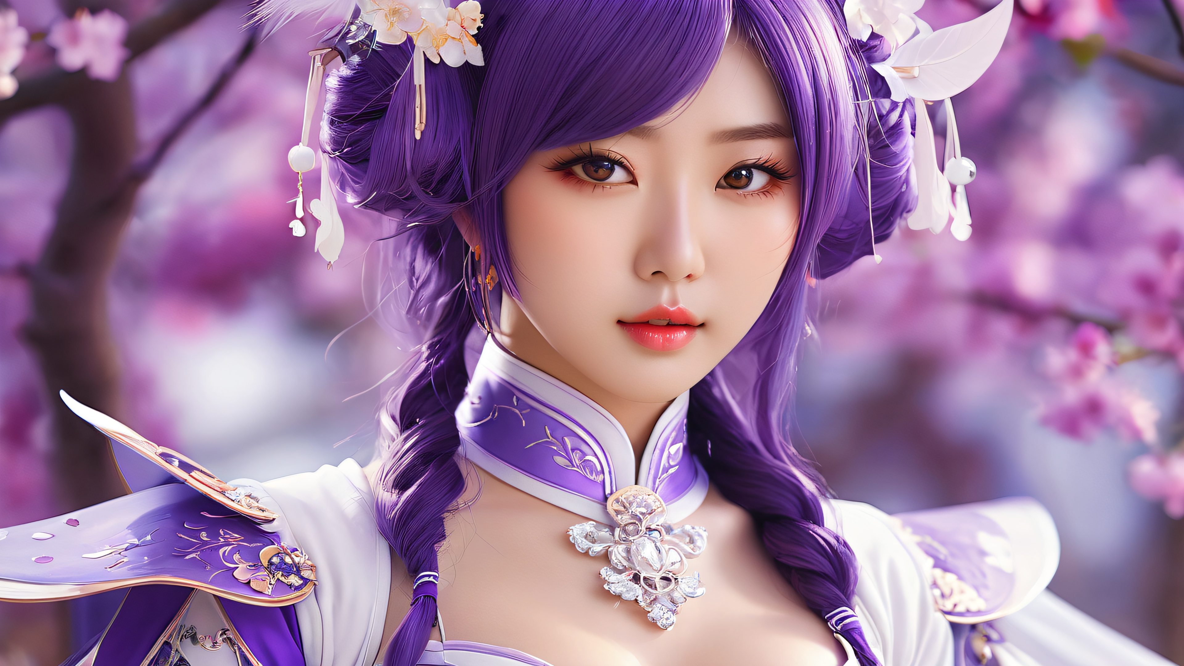This breathtaking wallpaper features an Asian cosplayer set against a pristine, pure void with an extreme depth of field. The scene is bathed in ethereal lighting, radiating brilliant colors and featuring ray-traced reflections that create a sense of depth and dimensionality. The artwork boasts intricate details and textures, making it a masterpiece of digital art.