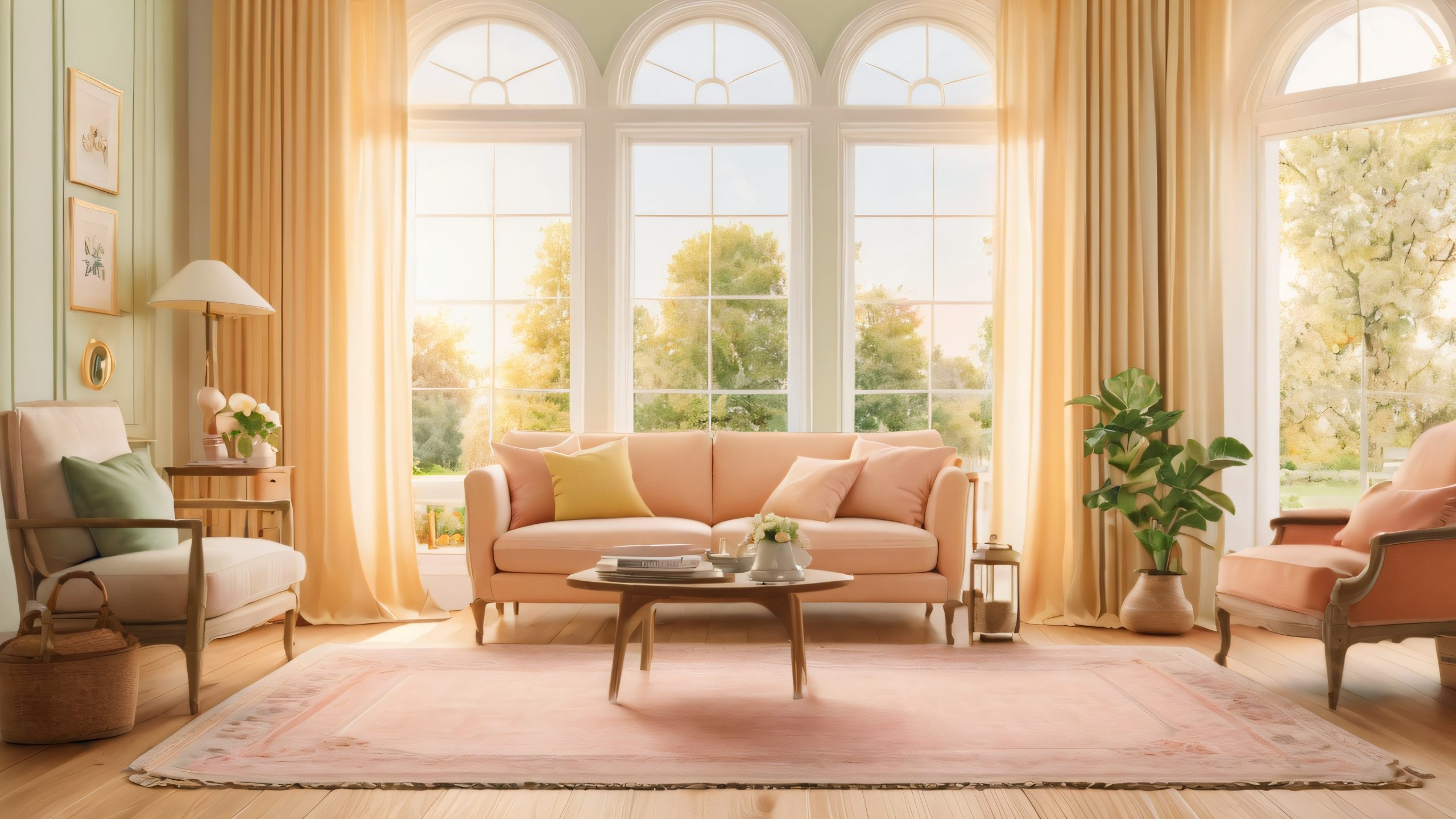 This serene scene features a lived-in space with worn wooden floors, soft drapes, and a large window framing a peaceful natural view. The warm golden hour lighting adds a sense of nostalgia, while the textured brushstrokes and subtle shading evoke a feeling of timelessness. Soft pastel hues and rich wood tones create a cozy atmosphere.