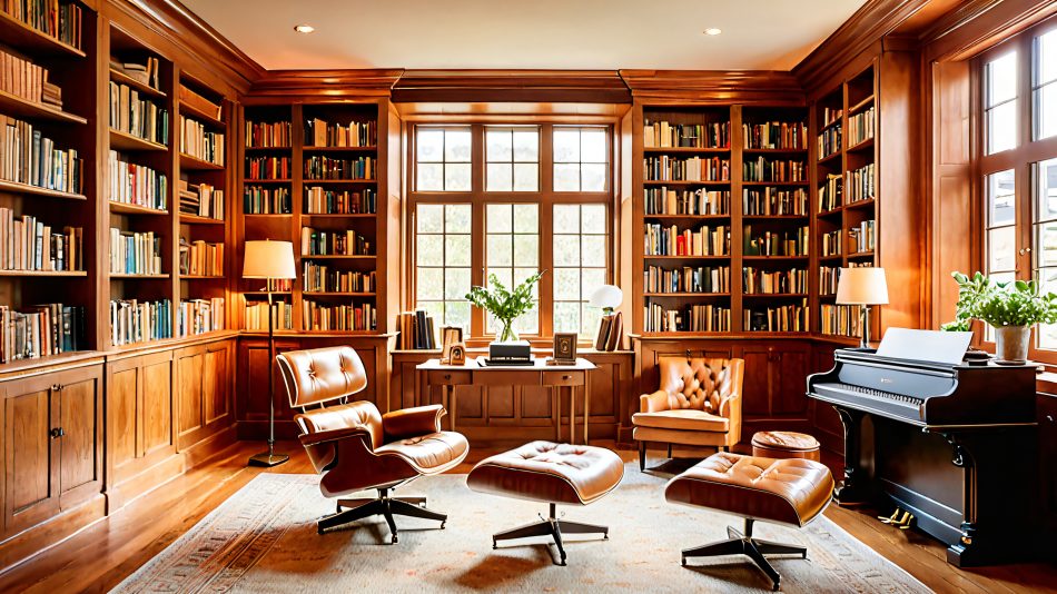 Warm, earthy tones and soft, dreamy textures evoke a sense of nostalgia and tranquility. The worn wooden bookshelves and rich leather armchairs blend harmoniously with soft pastel hues and subtle gradient effects, creating a cozy and inviting atmosphere.