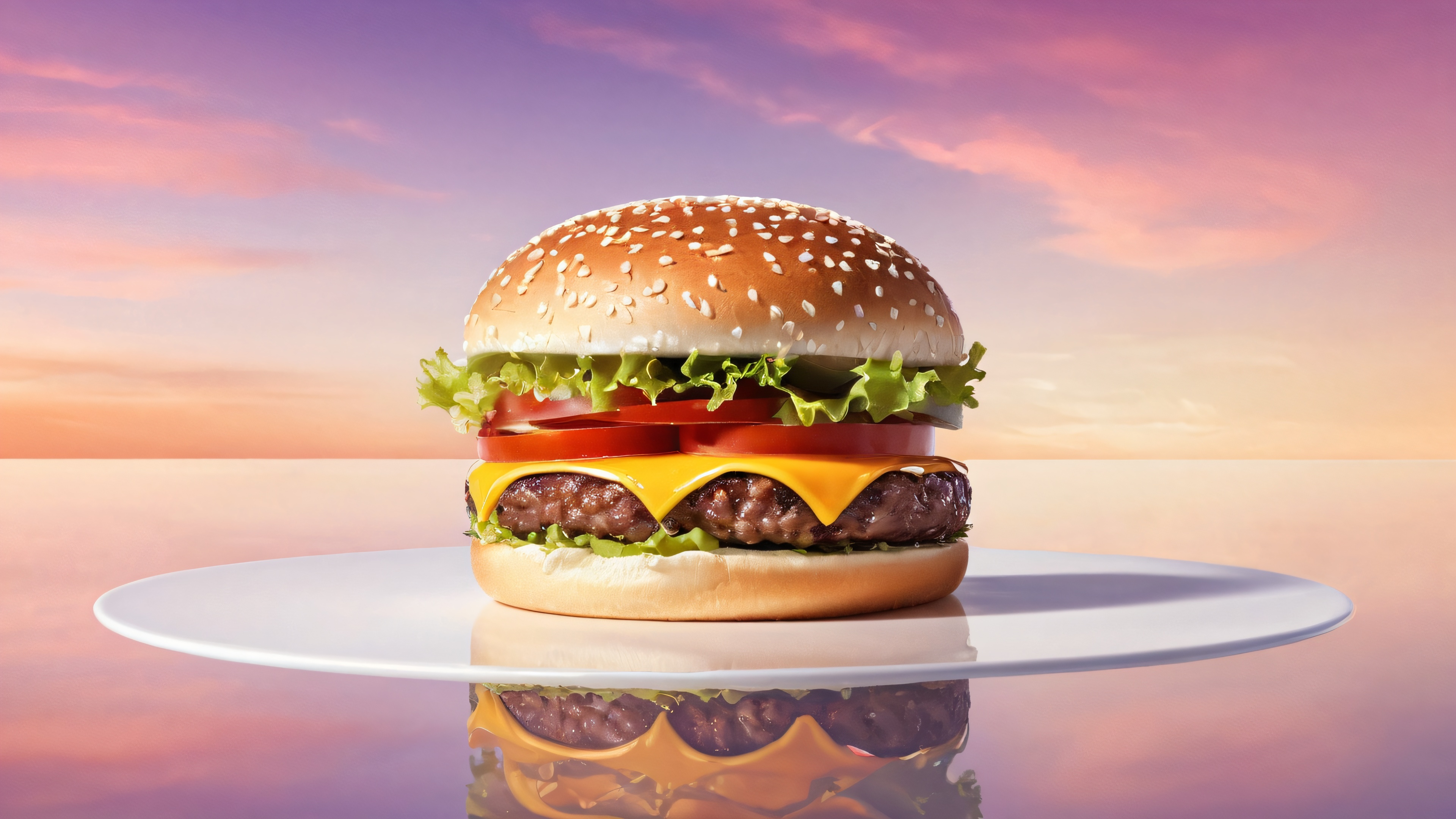 A breathtaking desktop wallpaper of Burger, Perfectly clean vast pure void, extreme depth of field, Award-winning digital art, pristine clarity, Ethereal lighting: Radiant, brilliant colors, ray traced reflections, and pristine clarity. Bright and airy., [‘Creamy’, ‘Warm’, ‘Sultry’], 16:9 aspect ratio, ethereal lighting, radiant, brilliant colors, ray traced reflections, pristine clarity, award-winning digital art, epic breathtaking scale, stunning visual impact, perfect composition, highly textured surfaces, intricate micro-details, physically based rendering, macOS wallpaper aesthetic, masterpiece, highest quality, highly detailed, 8k resolution.