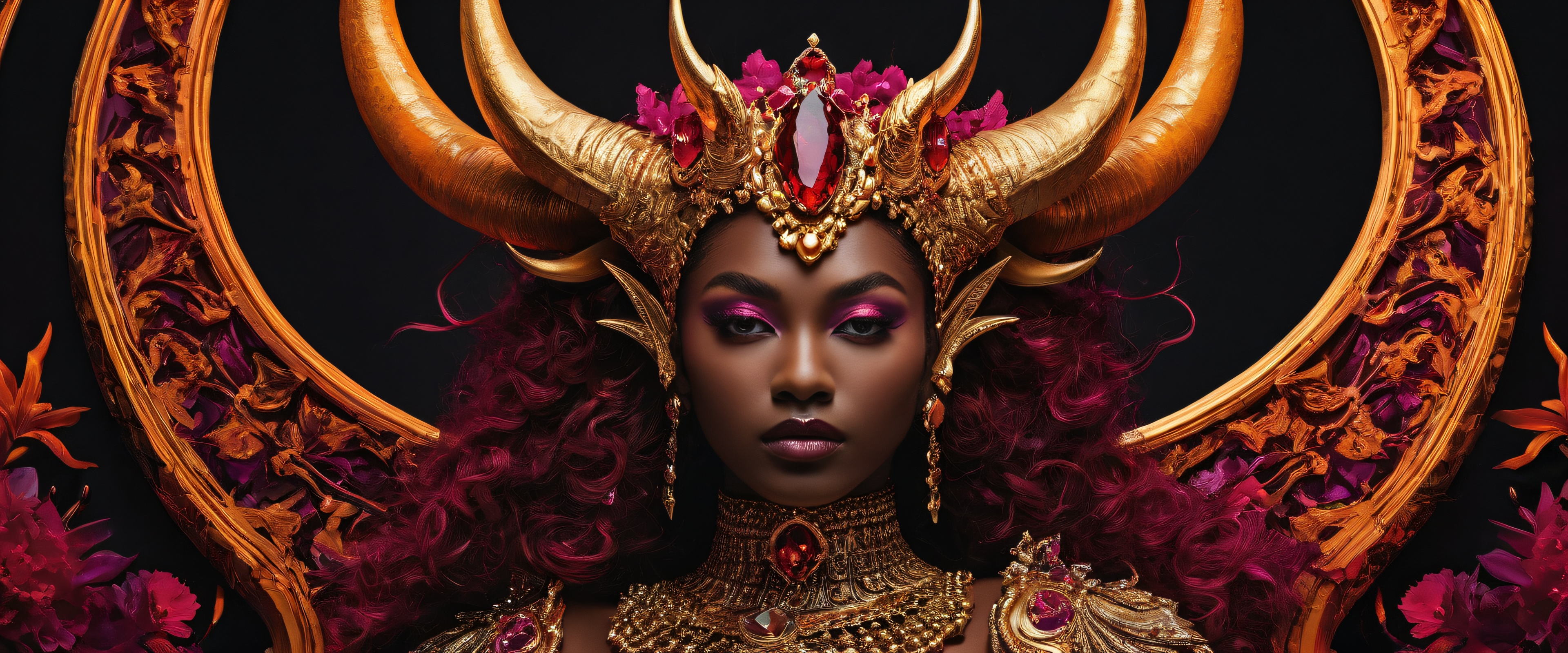 A breathtaking desktop wallpaper of Horned Queen, Perfectly clean vast pure void with extreme depth of field and subtle hints of crumbling structures, Award-winning digital art, pristine clarity with a focus on intricate details and vibrant colors, SLEEK DARK MODE AESTHETIC with deep perfect blacks, striking crisp contrast, and elegant luminescent accents in intense orange and magenta hues, {‘Mood’: ‘Crimson-Gold’, ‘Dominant Colors’: [‘Deep Crimson’, ‘Golden Blaze’]}, 21:9 ultrawide panoramic aspect ratio, epic wide shot, elegant low-key lighting, deep perfect blacks, striking contrast, sleek dark mode aesthetic, luminescent accents, deep rich colors, award-winning digital art, epic breathtaking scale, stunning visual impact, perfect composition, highly textured surfaces, intricate micro-details, physically based rendering, macOS wallpaper aesthetic, masterpiece, highest quality, highly detailed, 8k resolution.