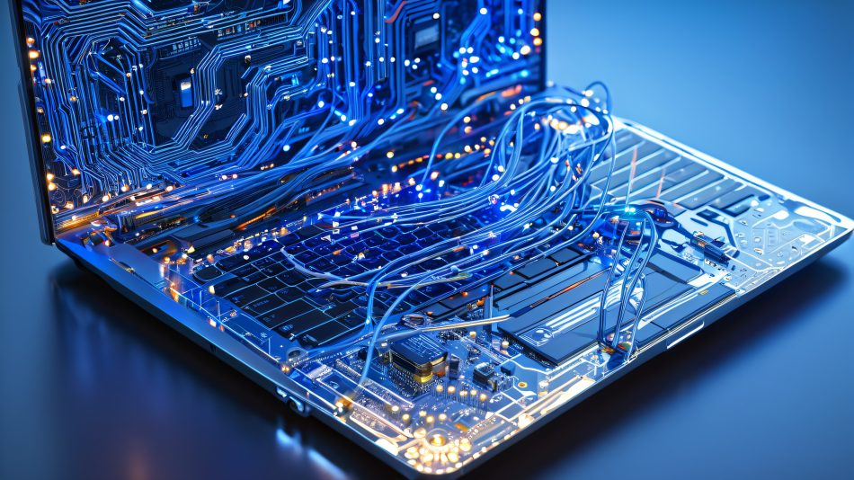 The image features a hyper-realistic 3D rendering of a futuristic laptop, its metallic surfaces reflecting warm highlights from the cinematic lighting. The laptop’s inner workings are illuminated by a mesmerizing web of interconnected cables, sparks, and LED lights, coalescing in a vortex-like structure that appears to draw the viewer in. Deep shadows add depth and dimensionality to the scene, with dominant blue tones complemented by accents of bright whites, metallic silvers, and fiery oranges.