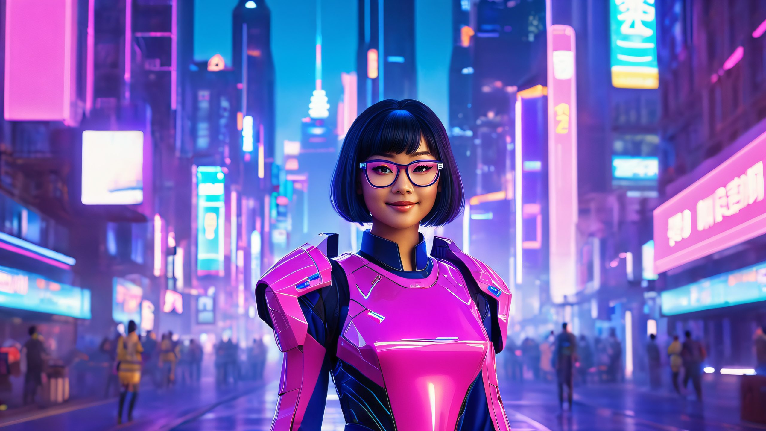 In this hyper-realistic 3D render, a young woman stands out against the backdrop of a dystopian city at dusk. The sky is painted with hues of indigo and purple, while the buildings’ facades shimmer with neon lights, holographic advertisements, and smoke. Golden light shafts pierce through the haze, casting long shadows across the pavement as the city awakens.