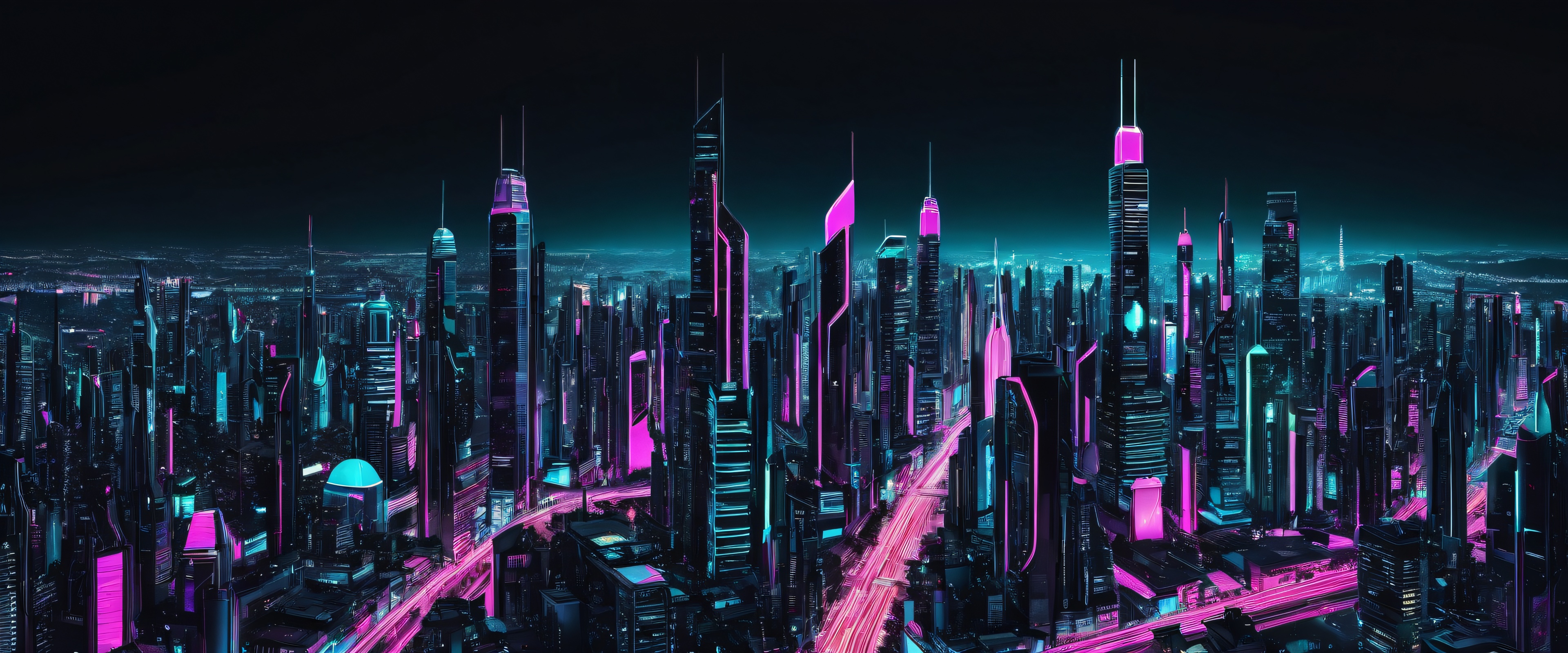 A breathtaking desktop wallpaper of Robotic Cityscape, Perfectly clean vast pure void, extreme depth of field, futuristic cityscapes, Award-winning digital art, pristine clarity, futuristic neon lights, SLEEK DARK MODE AESTHETIC: Deep perfect blacks, striking crisp contrast, and elegant luminescent accents, [‘Metallic Blues’, ‘Vibrant Neon Greens’, ‘Soft Pinks’, ‘Glowing Whites’], 21:9 ultrawide panoramic aspect ratio, epic wide shot, elegant low-key lighting, deep perfect blacks, striking contrast, sleek dark mode aesthetic, luminescent accents, deep rich colors, award-winning digital art, epic breathtaking scale, stunning visual impact, perfect composition, highly textured surfaces, intricate micro-details, physically based rendering, macOS wallpaper aesthetic, masterpiece, highest quality, highly detailed, 8k resolution.