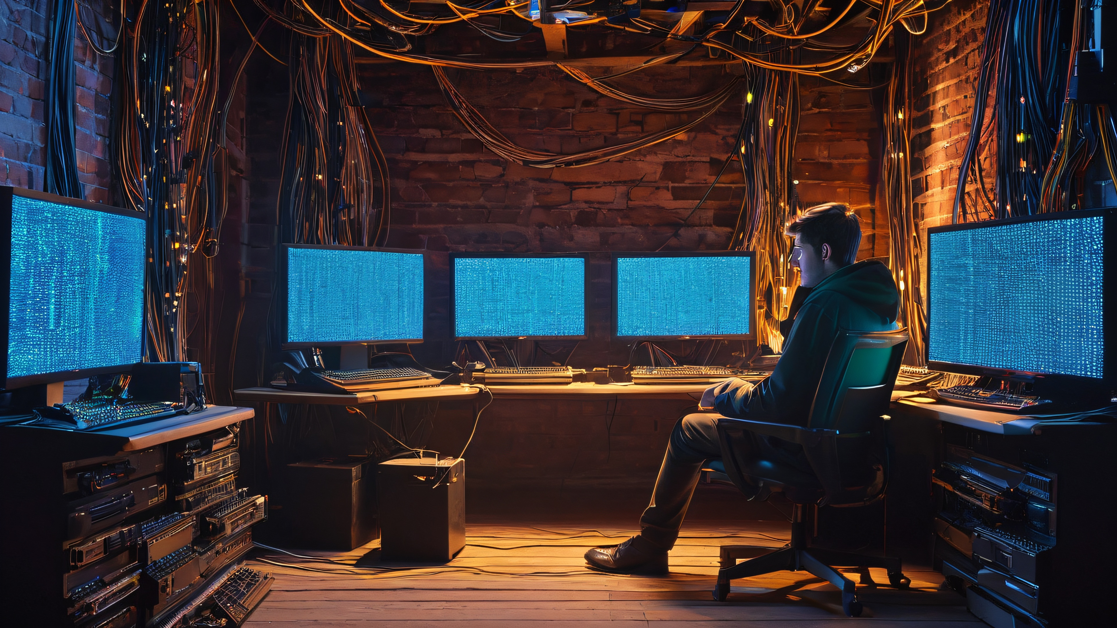 The scene is set in a cramped, cluttered dark room with exposed brick walls, creaky wooden floorboards, and a haze of cigarette smoke. The hacker sits intently focused, surrounded by rows of ancient CRT monitors and a tangled mess of cables and wires. The screens glow with a soft, pulsing blue light, casting an eerie glow on the hacker’s expression. The room is littered with old computer parts, dusty binders, and scattered scraps of paper with cryptic notes and code snippets.