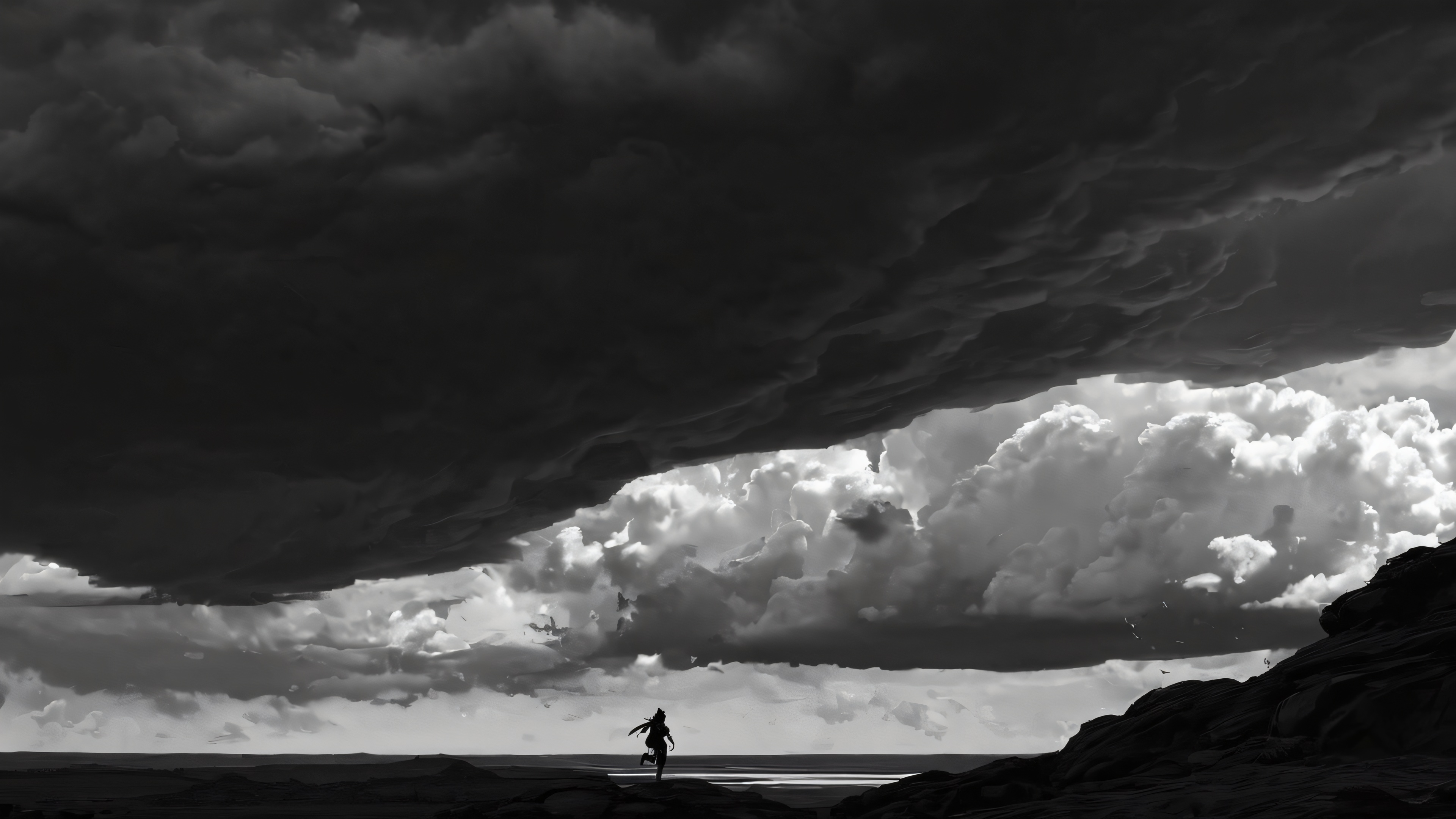 Breathtaking cyberpunk landscape featuring running video game characters set against an expanse of deep, perfect blacks and striking contrast. Elegant luminescent accents add a touch of sophistication to the sleek dark mode aesthetic.