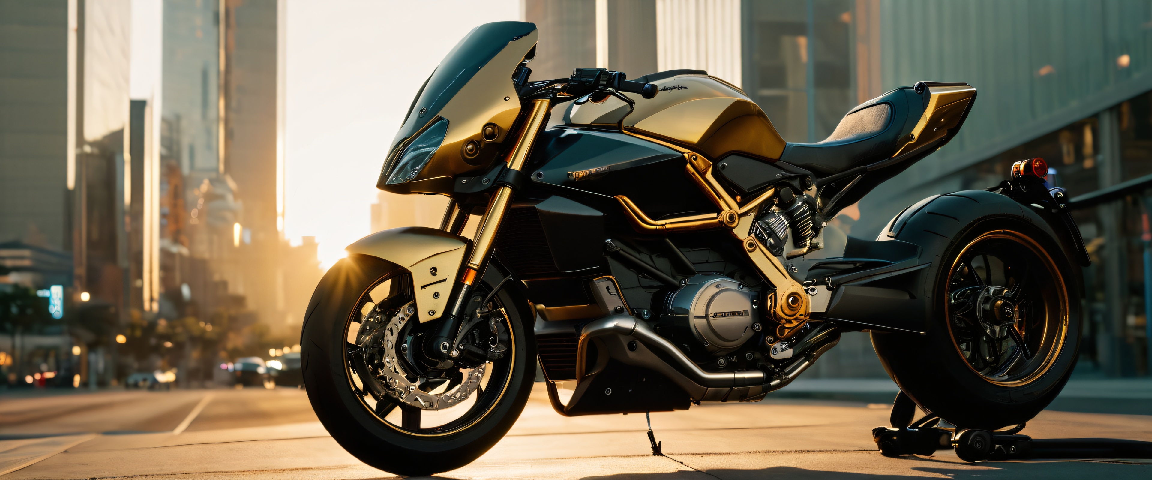 The image showcases a blend of organic and synthetic structures, with intricate metallic textures and geometric leading lines guiding the viewer’s eye. The warm golden sunlight casts long shadows, highlighting the motorcycle’s sheen and surrounding cityscape’s towering skyscrapers.