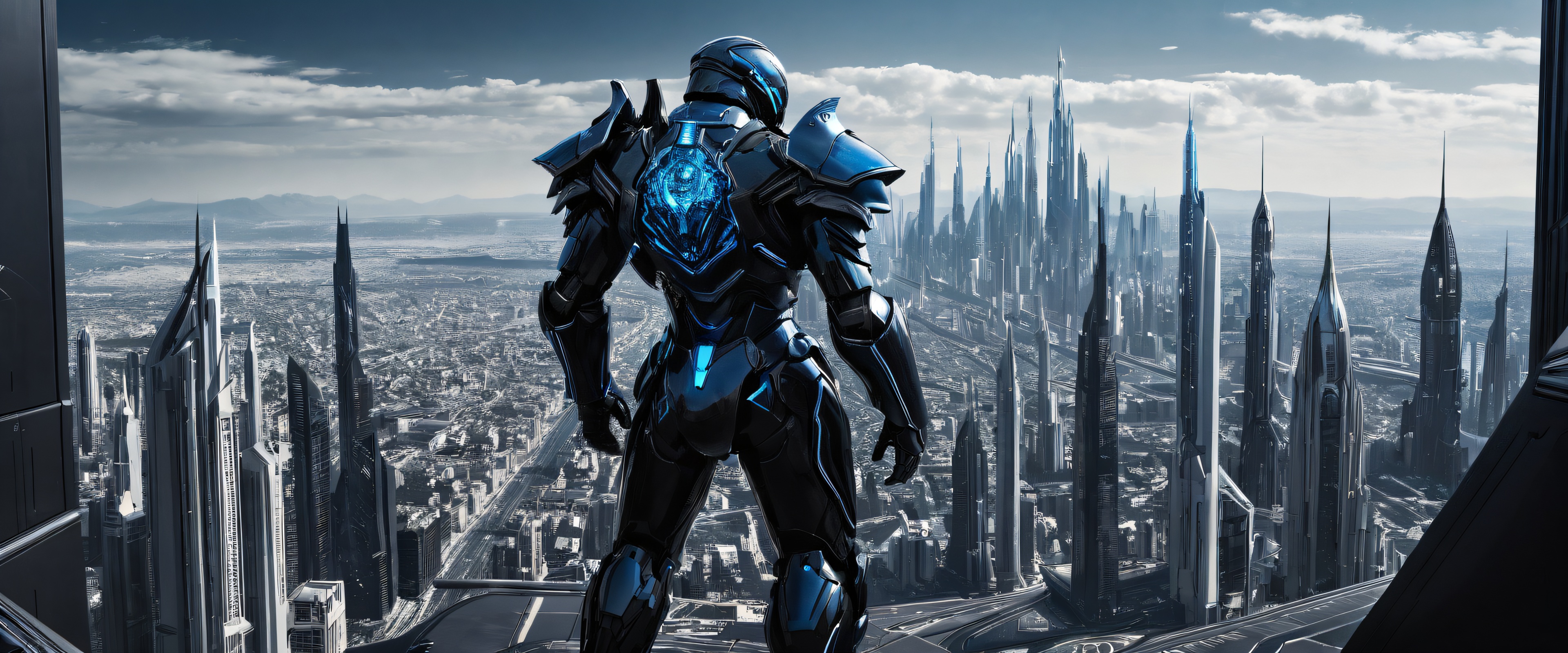 A breathtaking desktop wallpaper of Iron Rose Sentinel, Perfectly clean vast pure void, extreme depth of field, futuristic cityscape hint, Award-winning digital art, pristine clarity, detailed sci-fi armor design, SLEEK DARK MODE AESTHEThetic: Deep perfect blacks, striking crisp contrast, and elegant luminescent accents, {‘dominant’: [‘Blue’, ‘White’]}, 21:9 ultrawide panoramic aspect ratio, epic wide shot, elegant low-key lighting, deep perfect blacks, striking contrast, sleek dark mode aesthetic, luminescent accents, deep rich colors, award-winning digital art, epic breathtaking scale, stunning visual impact, perfect composition, highly textured surfaces, intricate micro-details, physically based rendering, macOS wallpaper aesthetic, masterpiece, highest quality, highly detailed, 8k resolution.