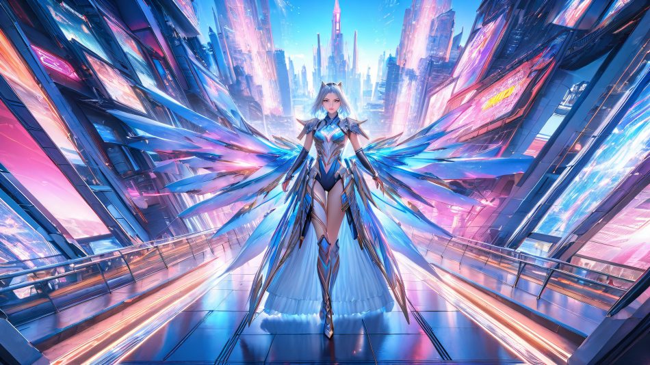 This stunning 4K wallpaper features a technologically advanced armored woman standing at the heart of a vibrant metropolis. Her intricately designed armor glows with a soft blue light, as she gazes out upon the bustling cityscape. The scene is set against a backdrop of towering skyscrapers, holographic advertisements, and a sprawling network of elevated walkways and monorails. The lighting is a blend of warm, golden hues from the setting sun and the cool, blue glow of the city’s neon lights, casting long shadows across the pavement. The palette is a rich blend of deep blues, electric pinks, and bright whites, punctuated by bursts of neon green and orange.