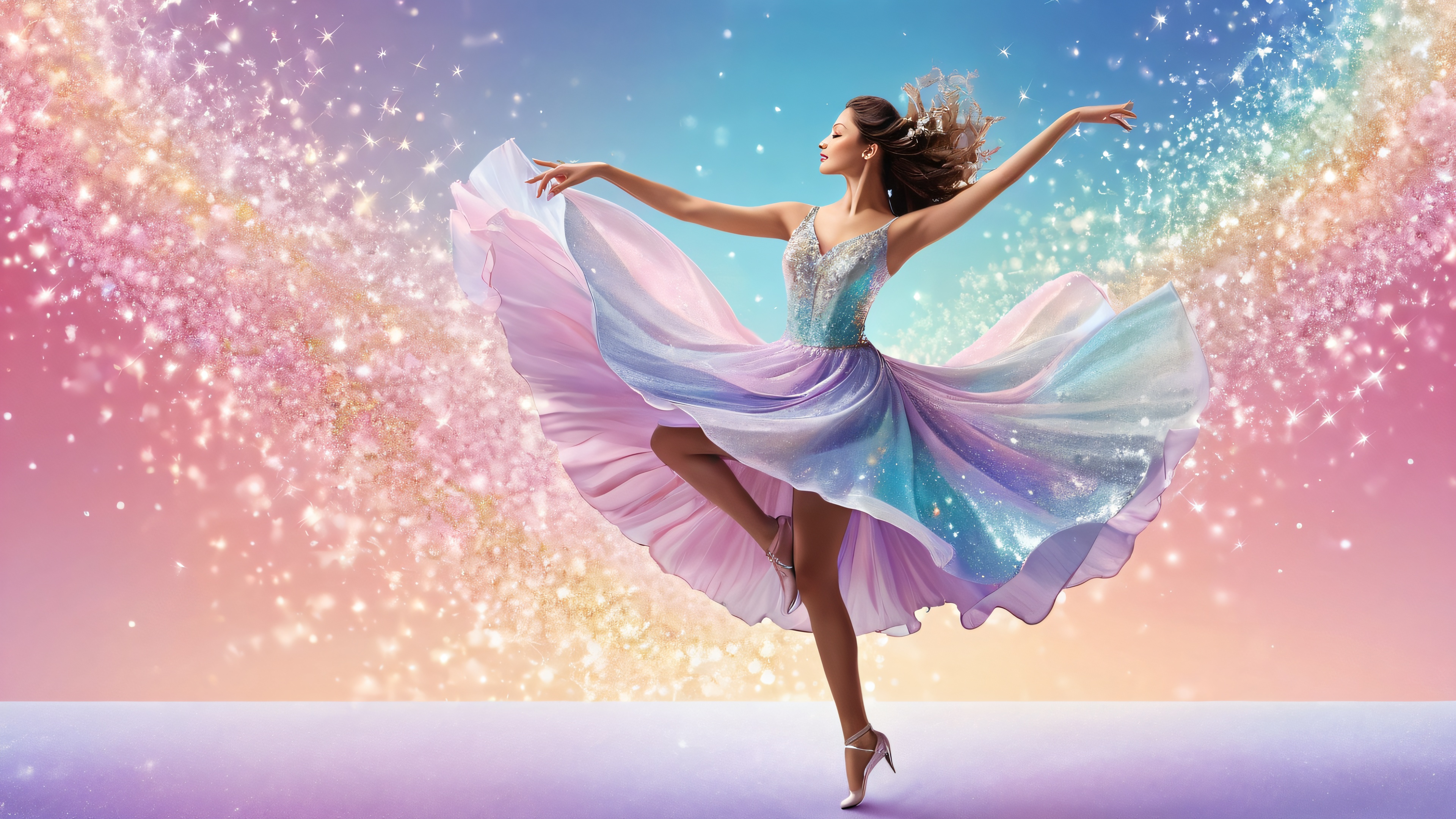 A breathtaking desktop wallpaper of Dancing Woman, Perfectly clean vast pure void, extreme depth of field to emphasize the dancing woman’s movement., Award-winning digital art, pristine clarity with a touch of whimsy and elegance., Ethereal lighting with radiant, brilliant colors, ray-traced reflections, and pristine clarity. Bright and airy, accentuating the joy and freedom of dance., Soft pastel hues with touches of shimmering glitter, evoking a sense of wonder and enchantment., 16:9 aspect ratio, ethereal lighting, radiant, brilliant colors, ray traced reflections, pristine clarity, award-winning digital art, epic breathtaking scale, stunning visual impact, perfect composition, highly textured surfaces, intricate micro-details, physically based rendering, macOS wallpaper aesthetic, masterpiece, highest quality, highly detailed, 8k resolution.