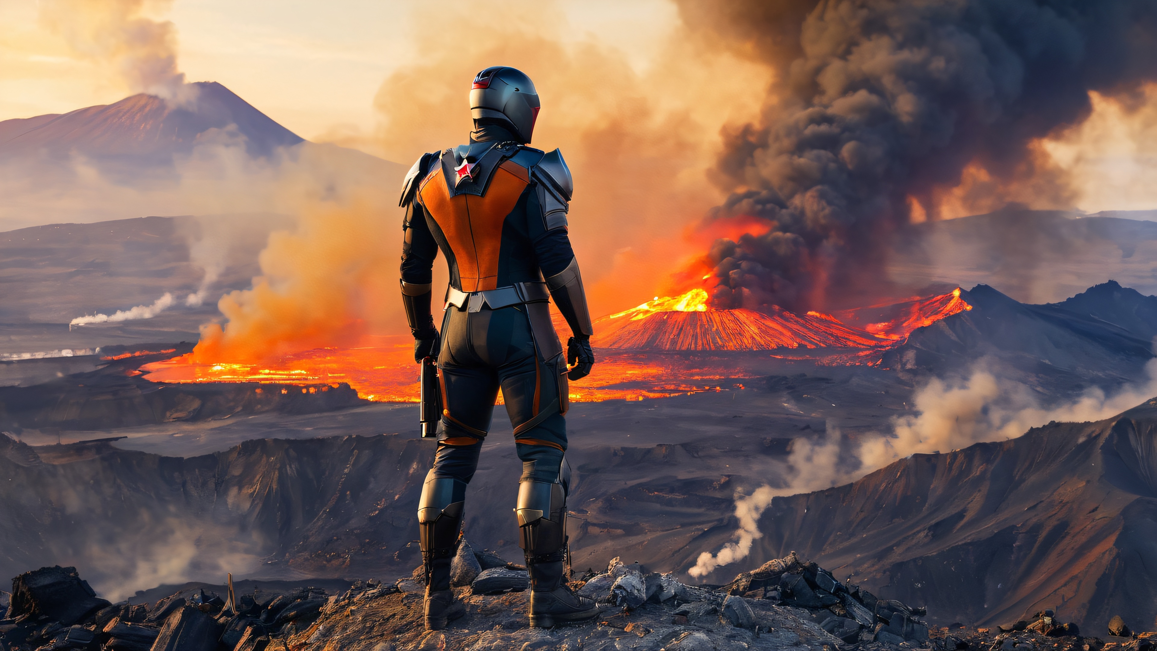This stunning 4K wallpaper features Daredevil perched precariously on the edge of a fiery volcano, his eyes glowing with determination as he surveys the desolate landscape below. The image is characterized by a dominant palette of deep oranges, charred reds, and smoky grays, with long shadows cast across the wreckage-strewn terrain. The once-thriving cityscape lies in ruins, with twisted metal and smoldering ruins filling the frame. The hyper-realistic, gritty aesthetic is grounded in textures and imperfections, with a focus on the fiery heat and devastation.