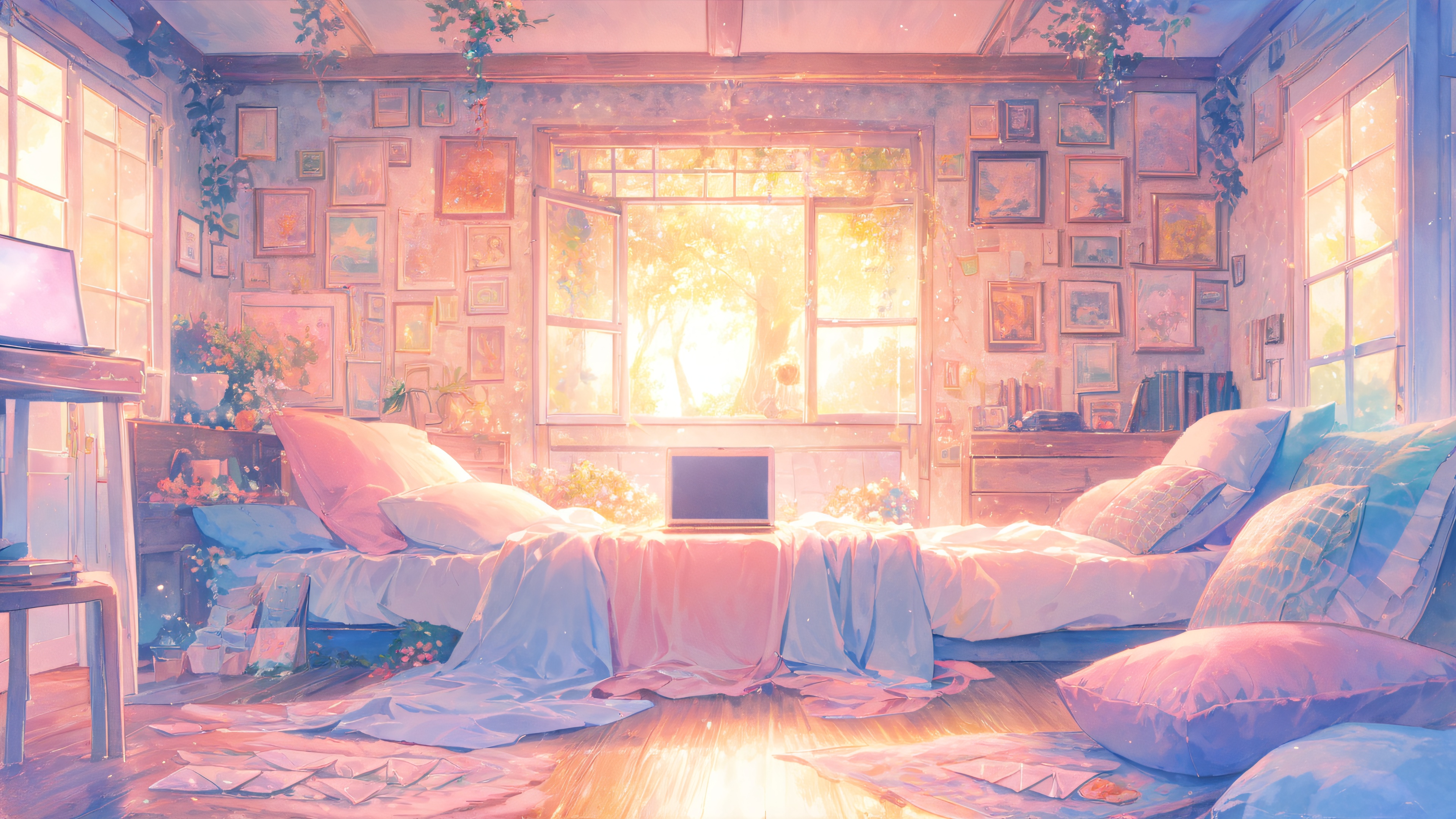 This breathtaking 4K wallpaper features Yoomi, a bespectacled protagonist, surrounded by a cluttered yet cozy room. The warm, golden light and soft pastel palette evoke a sense of comfort and daydreaming. The watercolor-inspired anime art showcases subtle texture and gradient effects, reminiscent of a forgotten Polaroid.