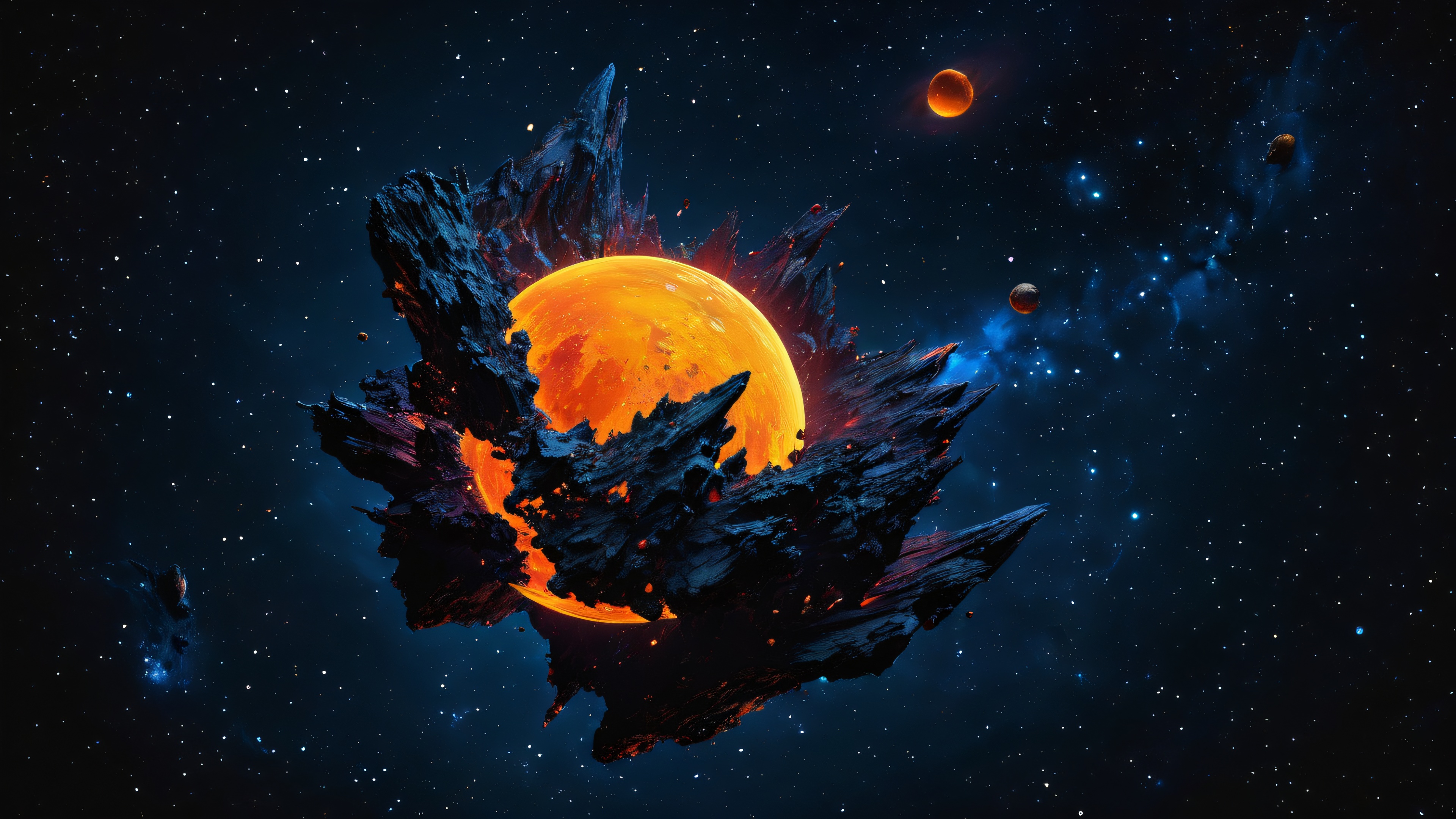 This award-winning digital art features the Asteroid Queen in a breathtaking 8K resolution. The sleek dark mode aesthetic is characterized by deep perfect blacks, striking contrast, und elegante Leuchtakzente. Warm golden hues with subtle neon blue undertones add depth to the composition. The scene’s epic scale creates stunning visual impact, with intricate micro-details and highly textured surfaces that evoke physically based rendering.
