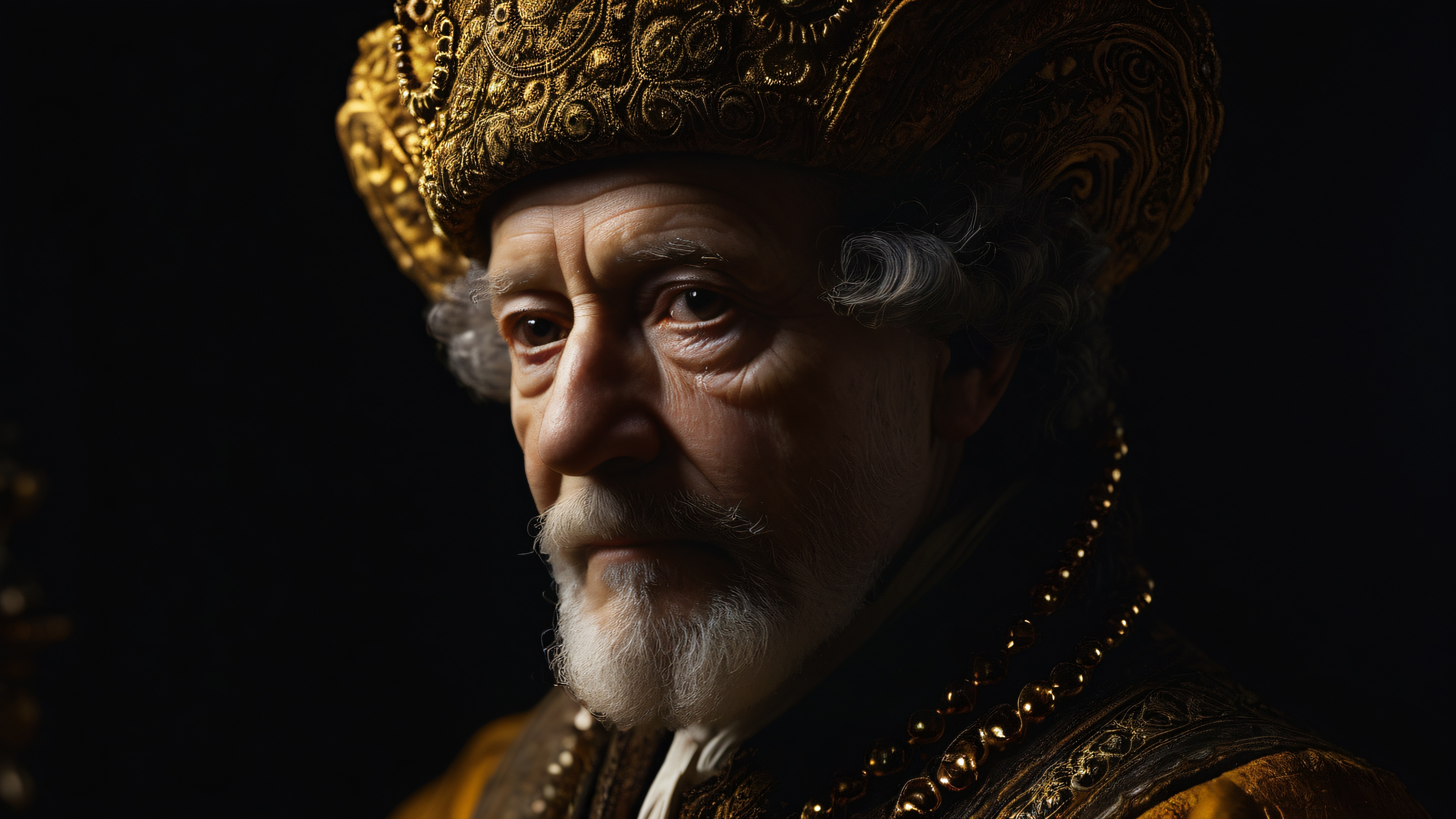 This 4K desktop wallpaper features a masterfully lit, high-contrast portrait of a mysterious figure, set against a minimalist background with slight texture reminiscent of aged canvas. The subject is placed thoughtfully along the rule of thirds, with extreme depth of field and creamy bokeh creating a cinematic atmosphere.