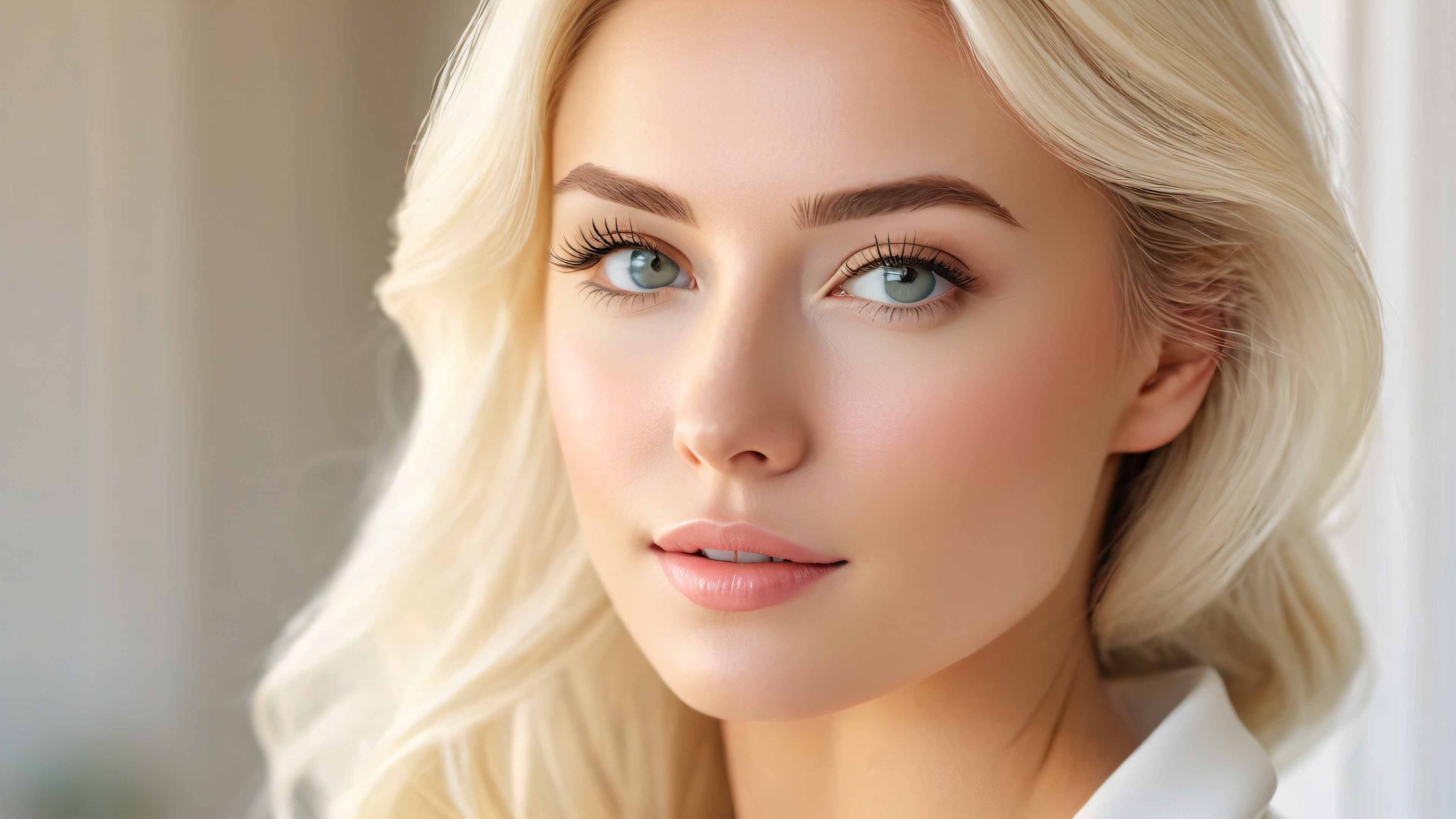This breathtaking 4K desktop wallpaper features a highly detailed and masterfully lit portrait of a blonde woman, bathed in warm soft natural light. The subject’s delicate features are captured with incredible precision, making for an intimately rendered scene that exudes elegance and sophistication.