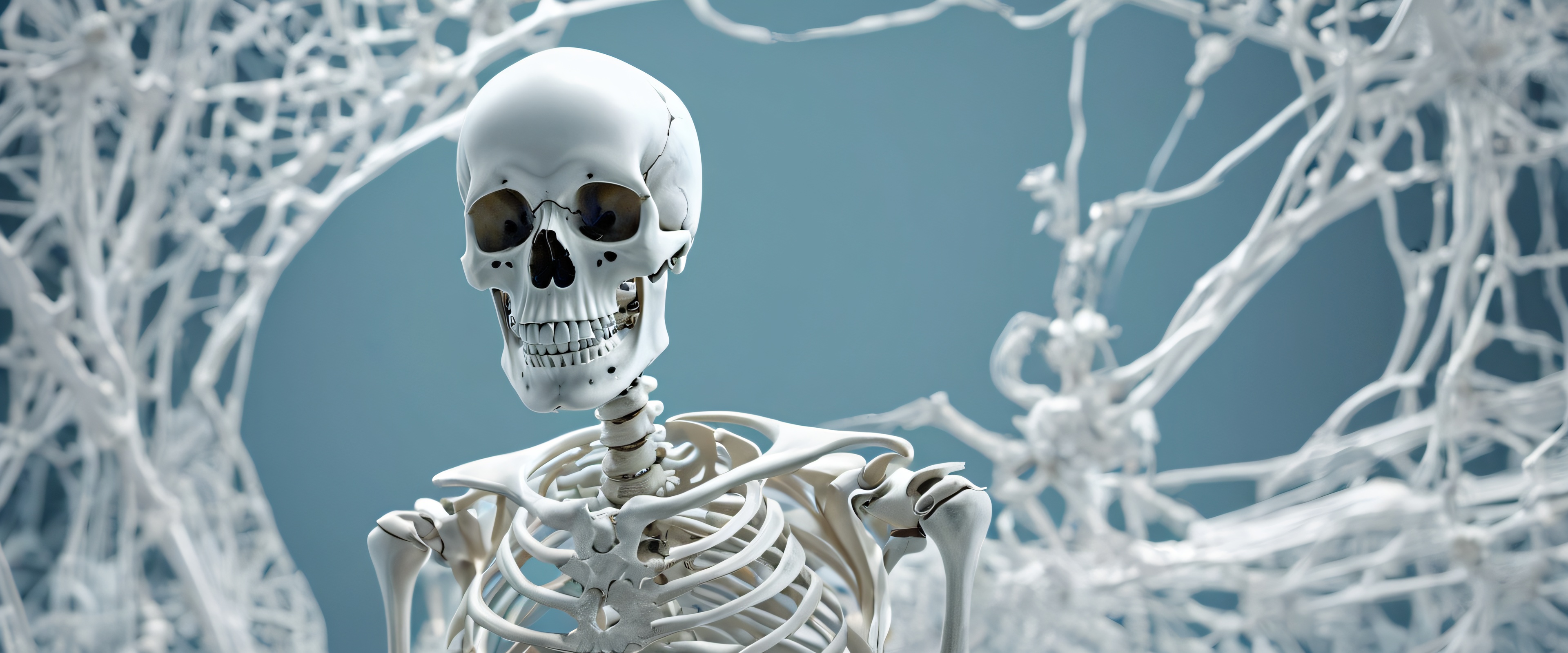 Ethereal lighting illuminates the ancient skeleton, its bones adorned with cobwebs, as it sits amidst a vast expanse of pure void. The scene is set against a cinematic backdrop of pristine clarity, where ray-traced reflections dance across intricate micro-details on highly textured surfaces. Brilliant colors radiate from the primary ‘CIVIT (white)’ and secondary ‘AI (blue)’ color palette, creating an epic wide shot that immerses the viewer in the breathtaking scale of this award-winning digital art masterpiece.