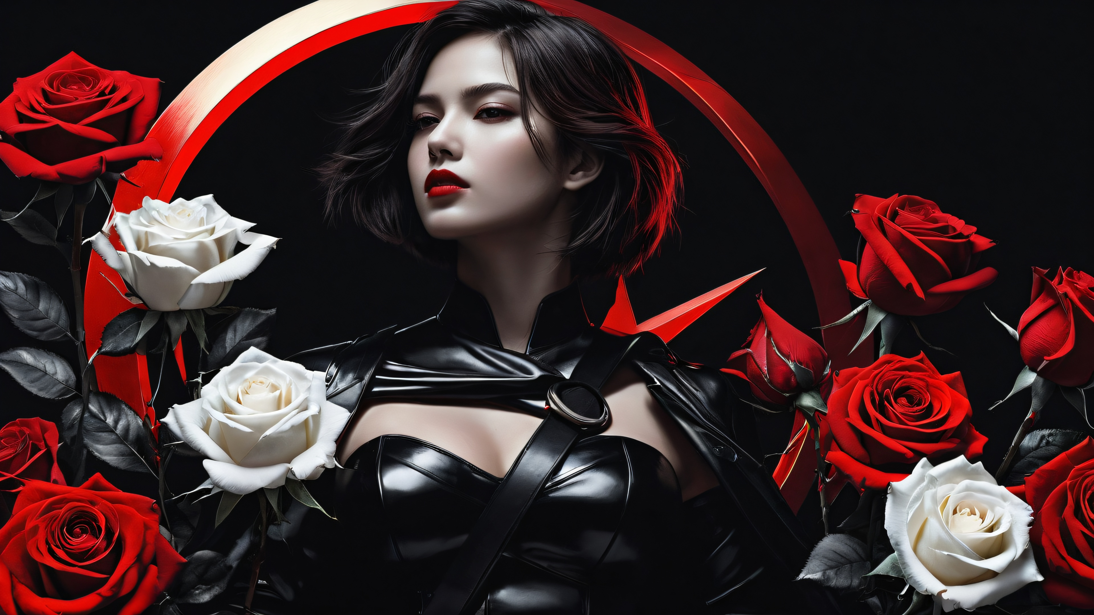A breathtaking desktop wallpaper of Girl, perfectly clean vast pure void, extreme depth of field, blood-stained white roses, hammer and sickle, award-winning digital art, pristine clarity, sci-fi illustration, SLEEK DARK MODE AESTHETIC. Deep perfect blacks, striking crisp contrast, elegant luminescent accents, dominant red, deep crimson, metallic silver, 16:9 aspect ratio, elegant low-key lighting, deep perfect blacks, striking contrast, sleek dark mode aesthetic, luminescent accents, deep rich colors, award-winning digital art, epic breathtaking scale, stunning visual impact, perfect composition, highly textured surfaces, intricate micro-details, physically based rendering, macOS wallpaper aesthetic, Meisterwerk, highest quality, highly detailed, 8k resolution.