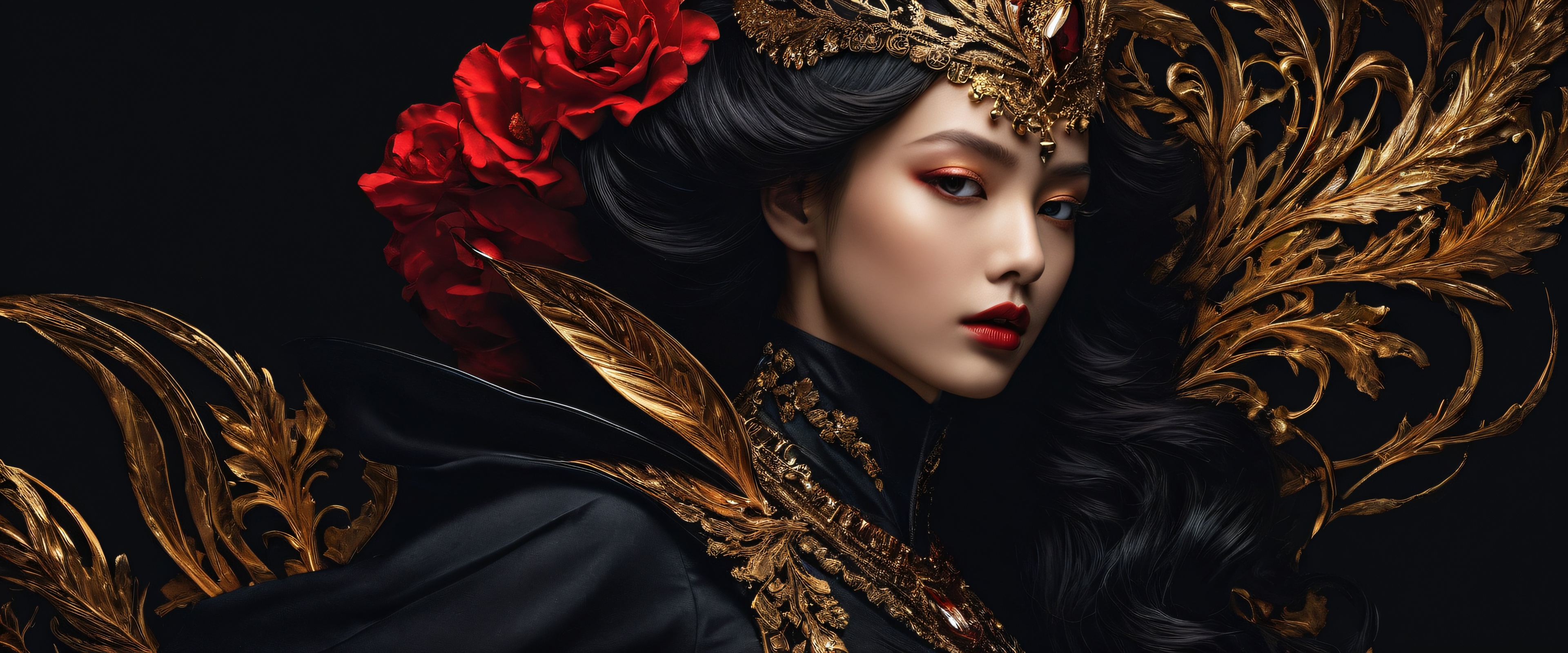 A breathtaking desktop wallpaper of Women, Perfectly clean vast pure void, extreme depth of field, Award-winning digital art, pristine clarity, Sleek Dark Mode Aesthetic. Deep perfect blacks, striking crisp contrast, and elegant luminescent accents., Red and Gold, 21:9 ultrawide panoramic aspect ratio, epic wide shot, elegant low-key lighting, deep perfect blacks, striking contrast, sleek dark mode aesthetic, luminescent accents, deep rich colors, award-winning digital art, epic breathtaking scale, stunning visual impact, perfect composition, highly textured surfaces, intricate micro-details, physically based rendering, macOS wallpaper aesthetic, Meisterwerk, highest quality, highly detailed, 8k resolution.