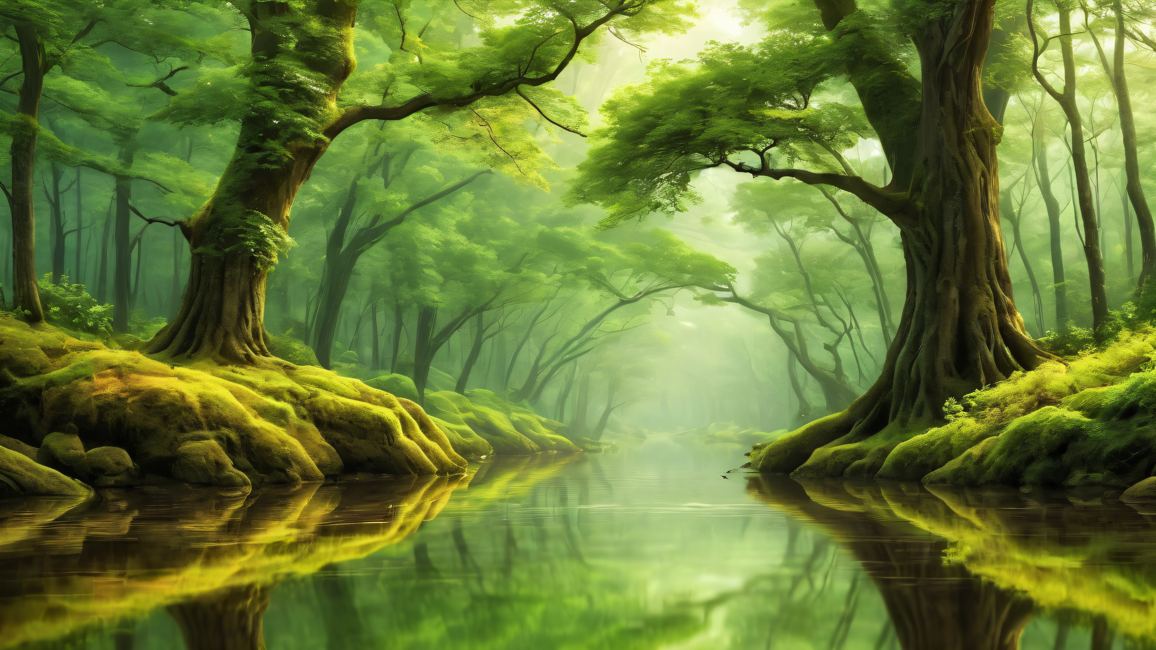 A stunning 8K wallpaper featuring an award-winning digital art masterpiece. The scene captures the essence of a tranquil forest, where towering trees rise from the ground, their canopies swaying gently in the breeze. A veil of misty fog shrouds the landscape, adding depth and mystique to the composition. The radiant lighting casts dappled shadows, showcasing the intricate micro-details on the tree trunks and leaves. This breathtaking scene is a perfect representation of nature’s serenity and beauty.