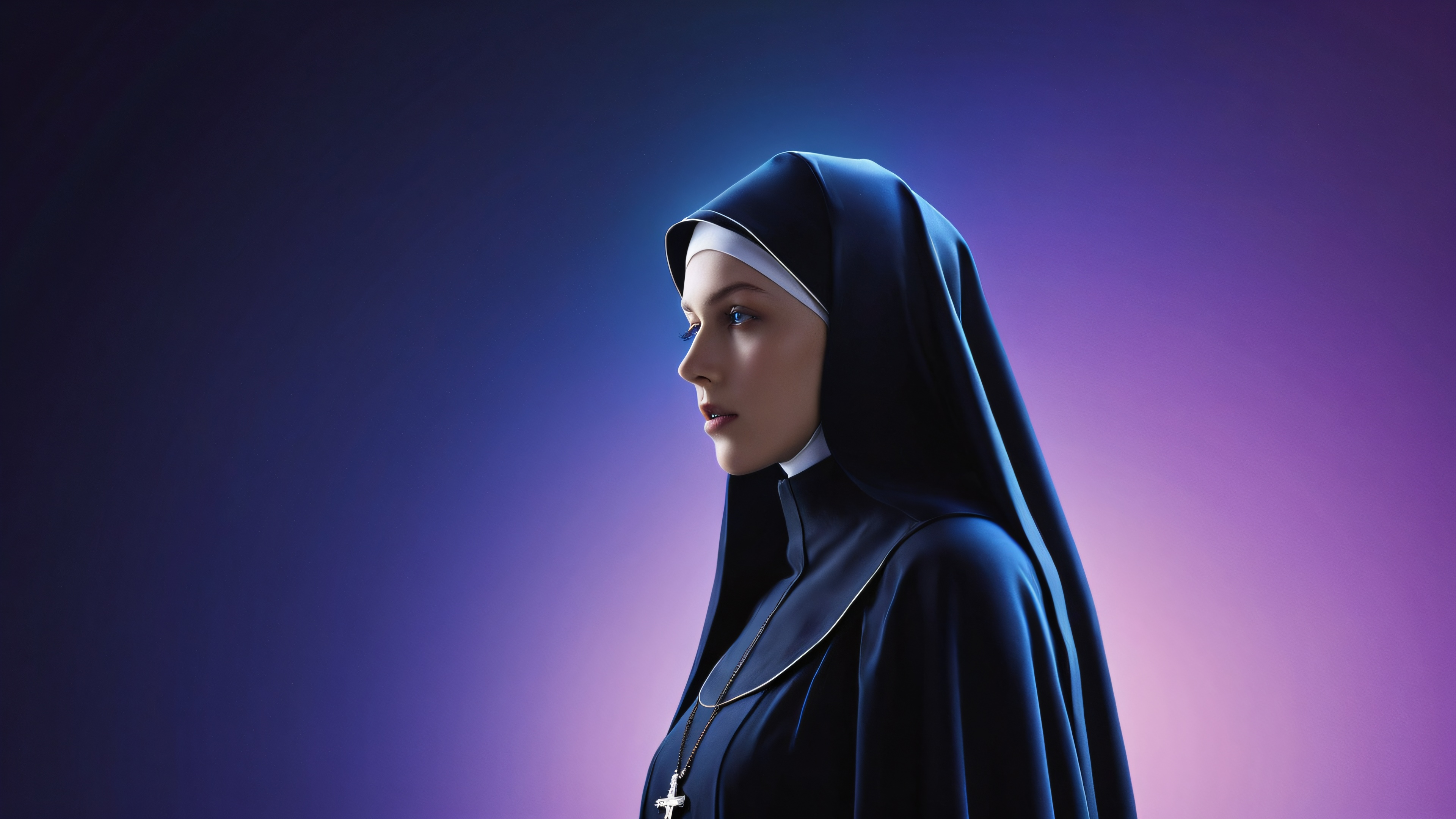 A breathtaking desktop wallpaper of {‘centered’: ‘Nun’}, {‘background’: ‘Perfectly clean vast pure void’, ‘atmosphere’: ‘Extreme depth of field’}, Award-winning digital art, pristine clarity, Ethereal lighting. Radiant, brilliant colors, ray traced reflections, und makellose Klarheit. Bright and airy., [‘Dark blues’, ‘Deep purples’, ‘Rich blacks’], 16:9 aspect ratio, ätherische Beleuchtung, radiant, brilliant colors, ray traced reflections, pristine clarity, award-winning digital art, epic breathtaking scale, stunning visual impact, perfect composition, highly textured surfaces, intricate micro-details, physically based rendering, macOS wallpaper aesthetic, Meisterwerk, highest quality, highly detailed, 8k resolution.