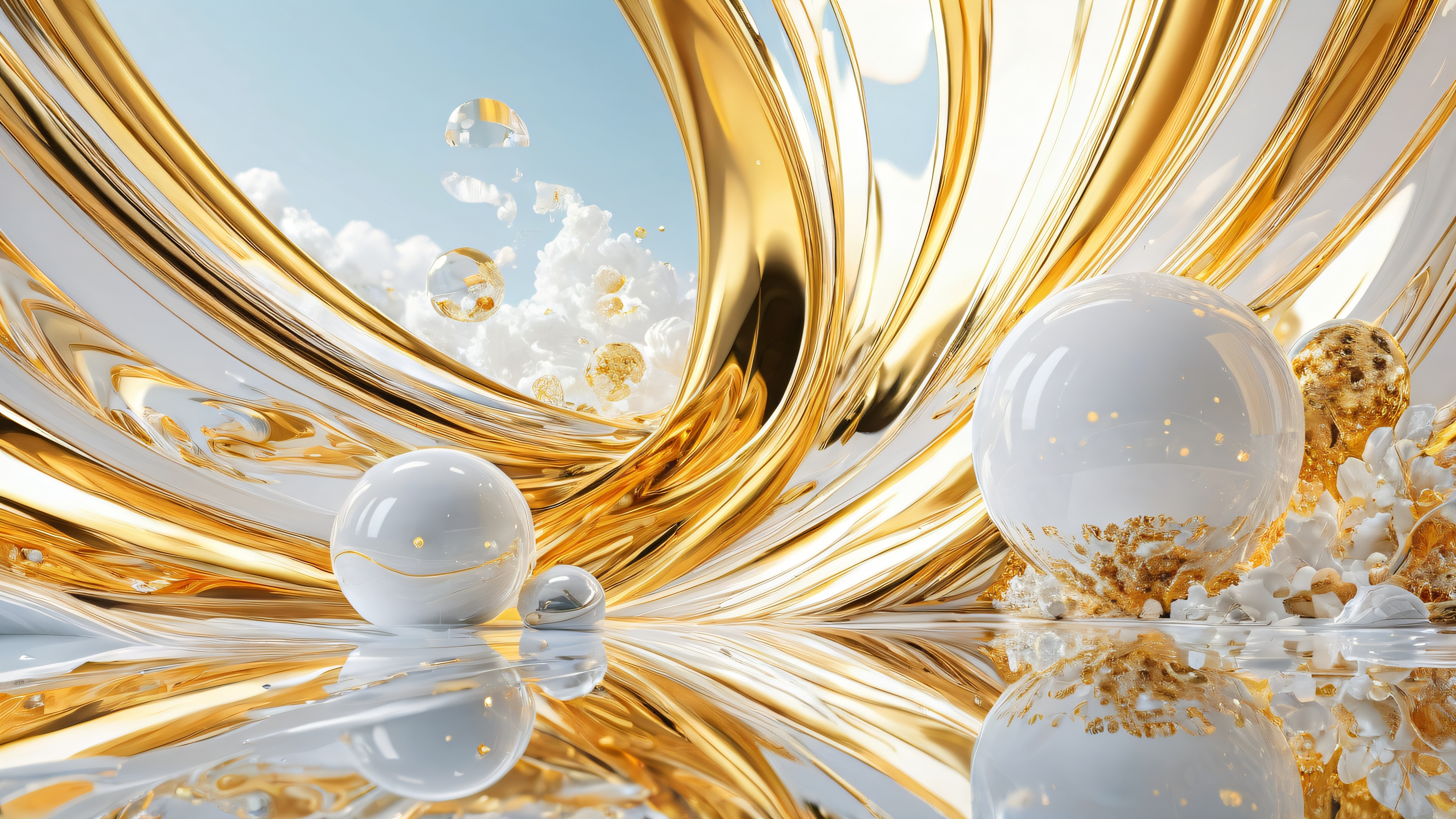 A breathtaking desktop wallpaper of Incredibly Absurd, Perfekt gereinigte weite, reine Leere, extreme Schärfentiefe, Award-winning digital art, pristine clarity, Filmic and Cinematic, Ethereal lighting, Radiant brilliant colors, ray traced reflections, pristine clarity, Bright and airy, [‘Cinematic Gold’, ‘Magical Whites’], 16:9 Seitenverhältnis, ätherische Beleuchtung, radiant, brilliant colors, ray traced reflections, pristine clarity, award-winning digital art, epic breathtaking scale, stunning visual impact, perfect composition, highly textured surfaces, intricate micro-details, physically based rendering, macOS wallpaper aesthetic, Meisterwerk, highest quality, sehr detailliert, 8k resolution.